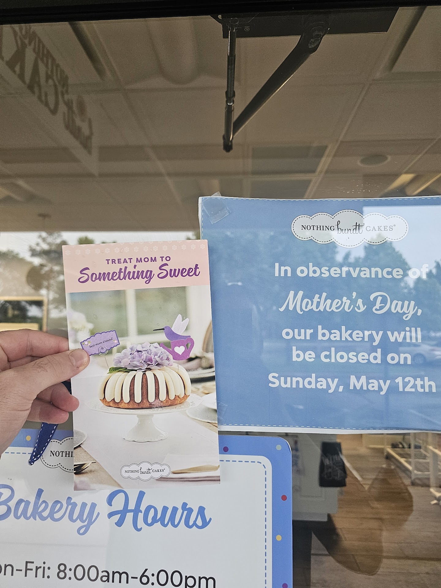 Read moreWhoever doesthe marketing for this location played a mean trick on their customers. We received a Mothers Day coupon in the mail this week. "Treat Mom to something sweet" it expires today, Mother's Day. Drove out of the way to pick up some Bundtlets for my wife to find a "we're closed in observance of Mother's Day" sign. I wonder how many customers they frustrated today? 3 stars because obviously Nothing Bundt Cakes rule. Just save the trickery for April Fools day, not...