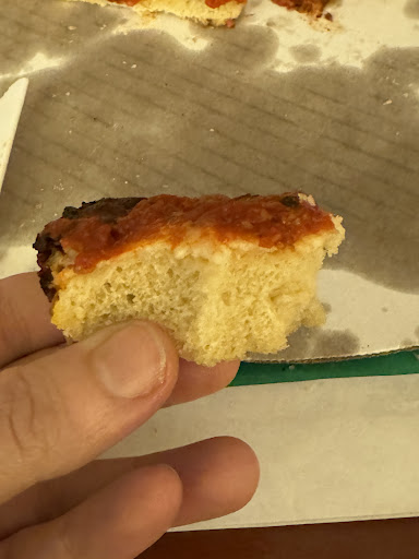 So the pizza… I’ll agree the pizza here is different. It’s thick and doesn’t have much sauce or cheese. Actually the pizza is bready. The crust is almost an inch thick, but it is light is texture. To me it resembles bread more so than what is typically thought of as a pizza crust. There is a slight caramelization to the crust resulting in what I have no better word to describe but a slight crust. Yes, I am saying there is a crust to the crust, but that should be indicative of how thick (and bready) the pizza crust is.