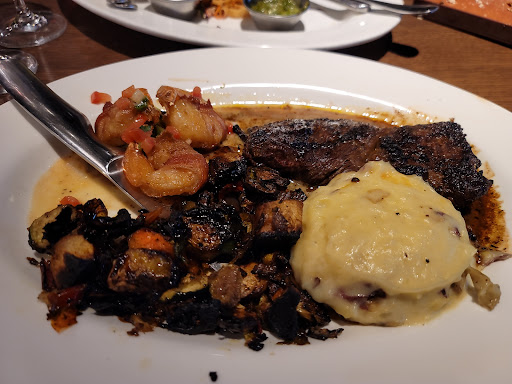 Our entrée was the Surf and Turf, which consisted of two Churrasco steaks, vegetables, mashed potatoes, potato au gratin, shrimp, fries, and a kids meal of Mac N' Cheese with fruit. Unfortunately, the vegetables were not charred, but rather burnt and bitter, with lots of soot. When I brought this to our waiter's attention, he stated that all the vegetables come out like that, which was unacceptable for a restaurant of this caliber. The mashed potatoes had an odd sweetness, suggesting the use of sweet cream instead of butter. The shrimp wrapped in bacon had an off taste, potentially indicating they were past their expiry date. The Mac N' Cheese was dry, and the use of tortiglioni pasta instead of elbow, cavatappi, or cellentani was not ideal for a kids meal. Additionally, the fruit for the kids meal was never served, and our waiter failed to inspect the food prior to serving it.