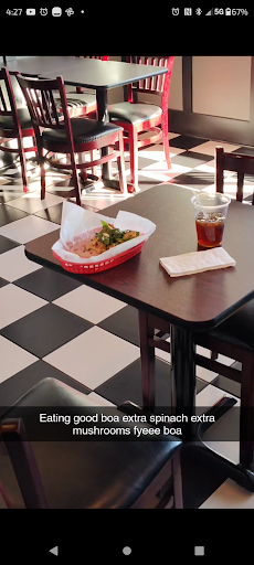 My wife and I walk in at 8:12, all the chairs are up on the desks. They close at 9... I ordered my pizza to go, and an order of fries. I get the fries quick, and am forced to eat them on the garbage can since there's absolutely nowhere to sit, 45 minutes before they close. A middle-aged white man walks in and says "folks you don't have to eat there. Please, have a seat." He takes down two chairs at a table, very cool of him. Turns out he is the owner and about the only decent human being working there.