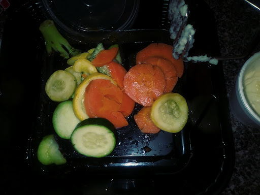 ...opening the (smaller than last time) containers I found..no au jus that I'd requested, two obviously burnt chunks of meat, two containers of mashed Baked? potato with skins, broccoli (ok) and "mixed veggies" consisting of badly sliced carrots and green and yellow some kind of veg... and a small loaf? of dark rye bread.