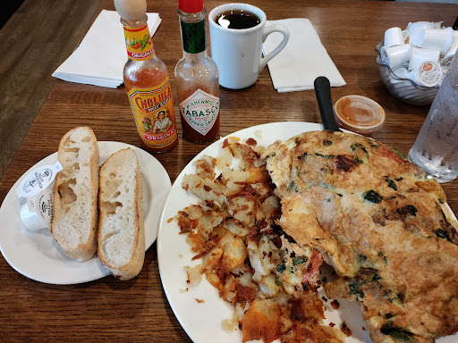 The food comes out and gets stacked on top of other food. Very unhygienic because the servers/waitresses should be grabbing the orders in order by the tickets placed. Meaning the bottom food is what should go out first, not the top stacked food. So, by the time your food comes to you, mediocre half cooked, it's room temperature. We also had pancakes that came with the order. And for the good reason to get the pancakes, so the servers/ waitresses don't touch all over your toast. I'll come back to that after the pancakes. Pancakes were probably made from a mass mix, the didn't taste homemade at all. They were quite tacky,semi fluffy, overall quite dense. The bit about the toast, under the hot food lamp, was a sheet tray of toast. Toast should be made to order not made then placed under a hot-food-holding lamp. And the servers/waitresses were touching with their BARE HANDS. Regardless if the hands of each waitress/server were washed, their hands should not come into contact(in this matter) with ready-to-eat foods. That's cross contamination! TONGS should have been used to grab the food and placed back upright in holding container for bread specifically. This is so that the part of the tongs that touches the food can stay clean; i.e. put the tongs in a container on the side of the servers/waitresses are on near the food so it's clean, organized, and efficient. I hope this review will help someone/the restaurant in choosing a better way to service the restaurant your eating...
