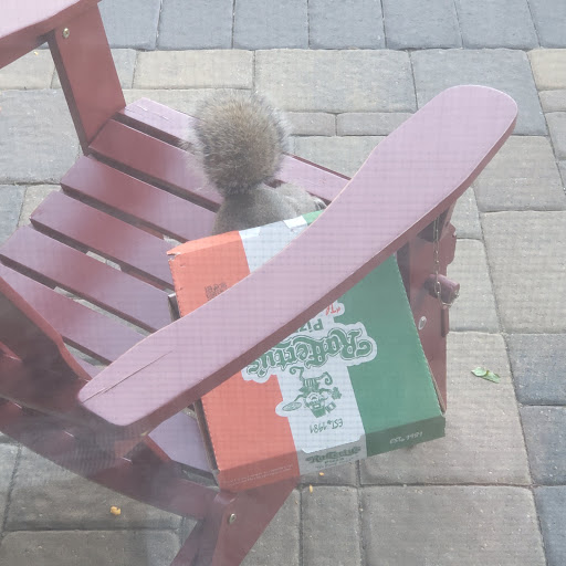Now here's the funny part...had leftovers and once back to Grand View Lodge pizza box would not fit in little fridge, so with it being cool outside set it on the patio chair. Looked out a bit later and even squirrels can't resist Rafferty's Pizza! Let him have his fill of two full slices of...