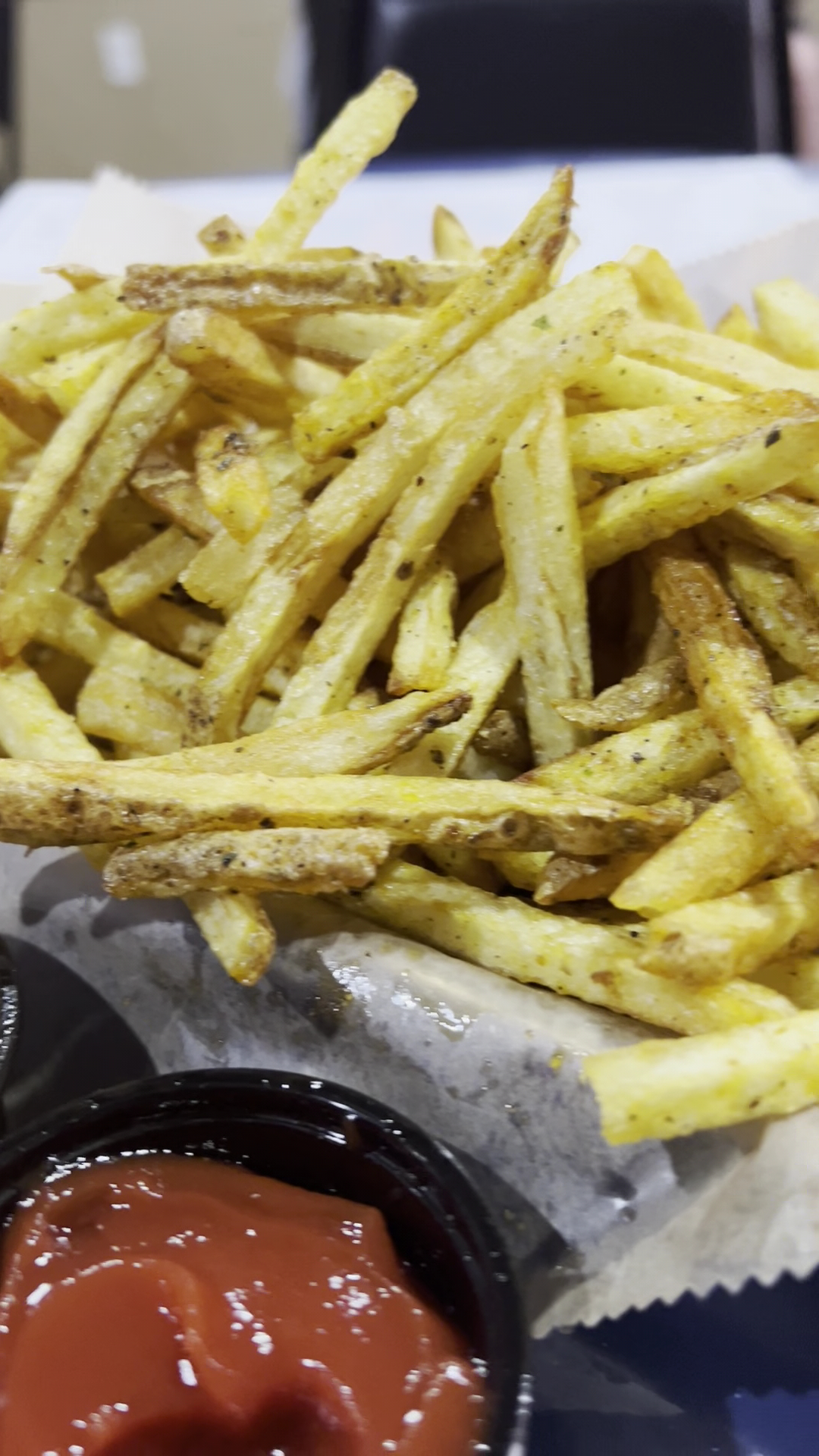 The fries are a natural cut shoestring that are seasoned with salt and pepper. You are served a literal mountain of fries. Fresh, hot, and delicious.
