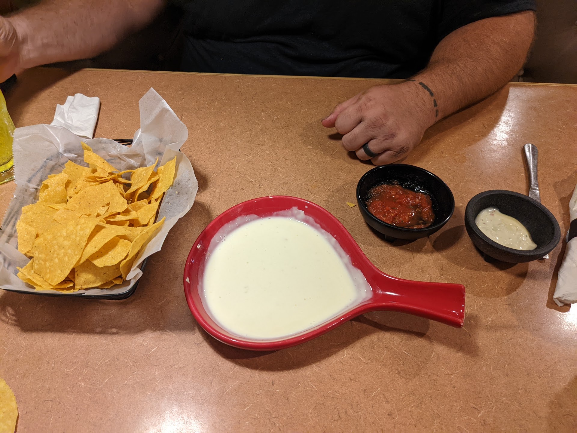 We typically love this place but today we were just completely dumbfounded by the service. First were served several day old stale chips. You couldn't even chew them. We had to request new ones. We then place our order, two regular taco salads one grilled. Every came out as ordered but mine. It says on the menu it comes with cheese dip very clearly. I explained nicely to the waiter if he could just bring me a small Lil bit of the cheese the salad didn't need remained. No big deal, right? Our waiter tried fixing it but the kitchen amusingly refused to give it to him. Tell him to relay its on the bottom. FYI, I eat this salad 2x a week and showed him it wasn't on there before he went back to the kitchen. He goes back same result. He just starts walking around the restaurant avoiding us.Then who I assuming is a young female shift manager comes over and ask if there is a problem. I explained the situation and how I never dreamed I'd be arguing over cheese dip that's supose to be on my food and how ridiculous it was! She then proceeded to tell me how my salad is made when I stopped her because I order this dish very often. Instead of just getting the two tablespoons of cheese dip, she offered to send back my salad and make a new one which made zero sense The waste from throwing my modify salad away literally cost 3x more than two tablespoons of cheese dip. My family was already halfway through their meal so why would I do that??? I explained to her I'd use the remainder of the cheese dip I paid for and would be back. Then proceeded to ask her was the 30 mins arguing over cheese dip really nessary when I showed it wasn't there?! I told her if they needed to be that unprofessional and petty that we absolutely will take our business elsewhere. I was seriously embarrassed for the restaurant. If you can't provide your customer with what they pay for which you provide on your own menu then you probably need to change your menu. Not to mention if your restaurant is in so much trouble that you litterally cause a scene of two tablespoons of cheese dip you should probably evaluate your business practices. How embarrassing and...