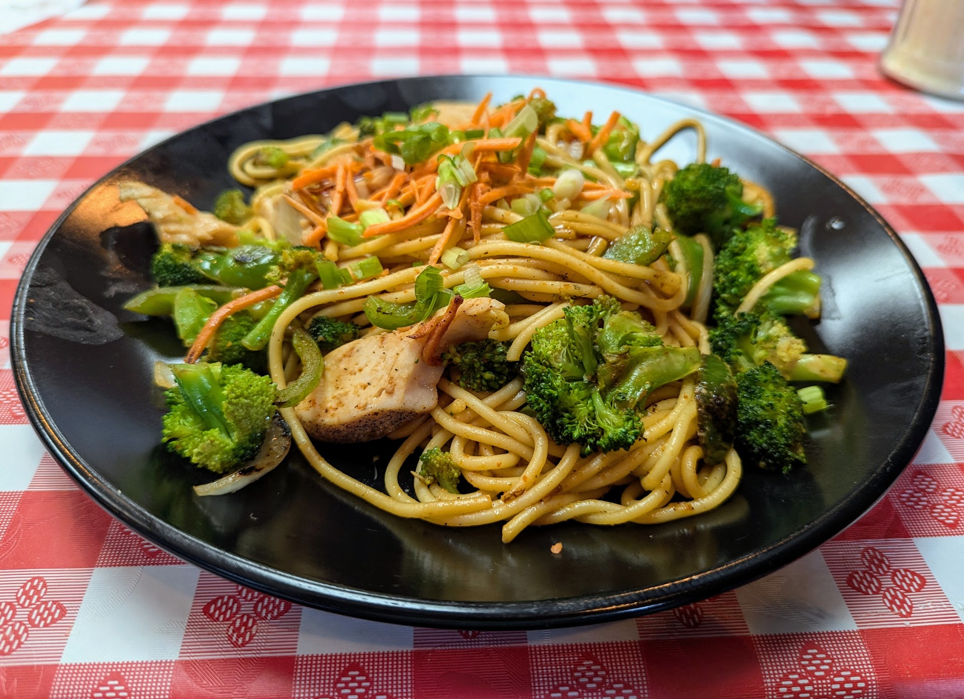 This was my second trip to this restaurant. It has changed considerably since the last time. I took a co-worker to lunch and didn't mention my previous experience so I could get her unbiased opinion. Her impression matched mine. The menu and the decor both seem to indicate that they haven't really settled on what they want this restaurant to be. The decor has no theme and seems to be just random items and photos placed at random. The menu appears to be a combination of an American home cooking style diner and a generic Asian fusion restaurant. The Asian party of the menu seems to have gotten considerably smaller since the last time I was here. I ordered the tsunami noodles and my coworker got a crispy chicken sandwich. The noodles are basic hibachi style teriyaki noodles but with a bit of spice. They come with chicken and vegetables, primarily broccoli. Most of the chicken pieces were pretty bland. Occasionally I'd get one that has a bit of caramelization and those were pretty good. My coworker said the chicken sandwich was okay but just a chicken sandwich. The menu said it's served on Texas toast but appeared to be just toasted white bread. Overall, it was a forgettable experience. In fact, I'm not really commenting on the service because I can't remember our server at all. If I'm with someone who wants to eat here, I won't say no but it's not likely to be somewhere I would think of...