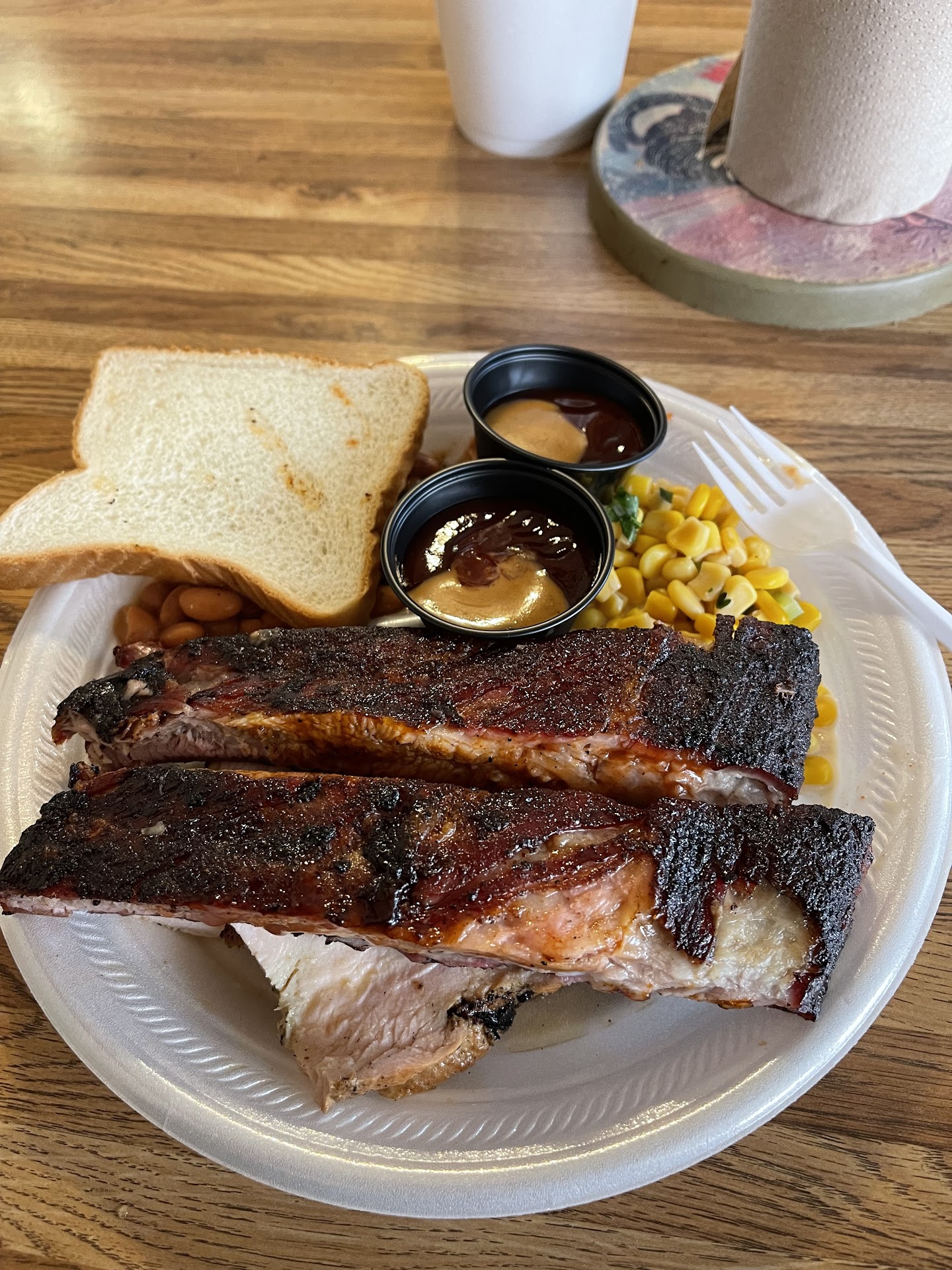 We had to splurge a little here and ordered more than our usual, including a side AND dessert. Right away we could tell this place was something special - the moist brisket was cooked perfectly and had a really nice rub. The sausages were removed from their holding warmer, and finished on a flat top with a little sauce - a unique method, but it turned out great. Just enough time for the sauce to caramelize a little bit, but not so much sauce that it overpowered the flavor of the sausage either. We were also able to sample their Scorpion Sauce, a habanero-infused BBQ sauce that provided a nice kick to an occasional bite. I especially liked it with their pork spareribs. For the side, of course we selected the Firecracker Corn (who could resist with a name like that). A fresh kernel cream corn, with heat from jalapenos, poblanos and pepper, but not too much cream. Just enough to temper the heat a little.