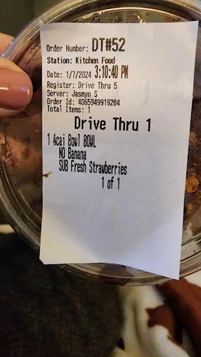 Read morevery VERY disappointed with the service of AND ATTITUDE of Jasmyn here today. Son ordered the acadia bowl with no Strawberries extra bananas. Girl instantly had attitude on speaker when he ordered because it had to be specially made. Got to window and she hands him his bowl with strawberries no banana. He said no thats not what I ordered and said I ordered "just bananas no strawberries ". She said "well of course you didn't!" With attitude!!! She then went in back, brings him another bowl, no strawberries, just bananas. He gets to work, the bottom of bowl is so hard and frozen he can not even eat it!! For $9.49 and a frozen bowl you can't even eat before having to go back to work...I would definitely have to say I would NOT SUGGEST THIS PRODUCT...ALSO, for the size of this product I think the price is ridiculous. I love the smoothies. And sadly one person's attitude may have just ruined my opinion of this store. Note : he had bowl in fridge 2 hrs before bringing home and it is still frozen. Must have been solid ice...