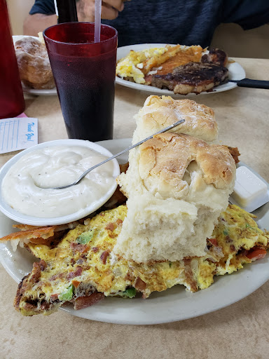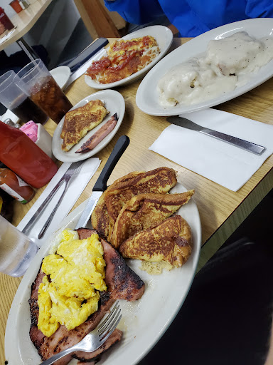 In under 3 minutes they seated me. That's fast! Lots of wait staff. Deciding your order goes fast for a reason. Menu for breakfast is one page, and choices are simple, eg. Toast or B & G. What kind of toast, I asked, eg. English muffin, Sourdough, Raison, Wheatberry, Rye? A low cost upgrade to a single "doller" pancake with Blueberries? No. Simply Regular or Texas toast.