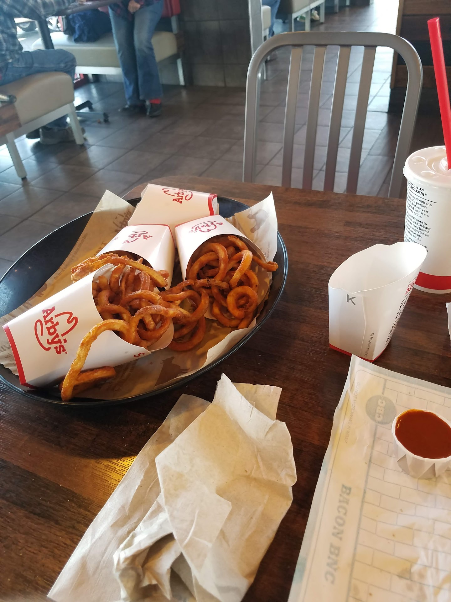 My roommate and myself, went originally through the drive thru at this location when business was slow no one was inside and we were the only car at the window, we wait several minutes for service. Eventually my roommate said hello, I’d like to order please. In which we got the response of “ we will be with you as soon as possible” , then we said okay. Then over 10 Minutes go bye, and now the line of cars has come to 4 cars behind us, with no one taken our order yet still. So, I suggest we go inside the restaurant to find out what is going on, and as someone who used to work at an Arby’s I am very unimpressed with service from drive thru workers who were just sitting in the window not doing anything. Needless to say, the front of house person. Their first language was not English nothing wrong with that. But, it little frustrating having to repeat a name for an order 3 times, after being ignored in the order speaker prior to that. Also went roommate placed her order in she asked for Arby’s sauce for her to go order. The same person that took the order proceeded to gesture to the inside condiments depositor. Which was also annoying because the order was “to go”, and she was asking for packets in the bag. The food was not a disappointment but your worker service sucked. Which really broke the back...
