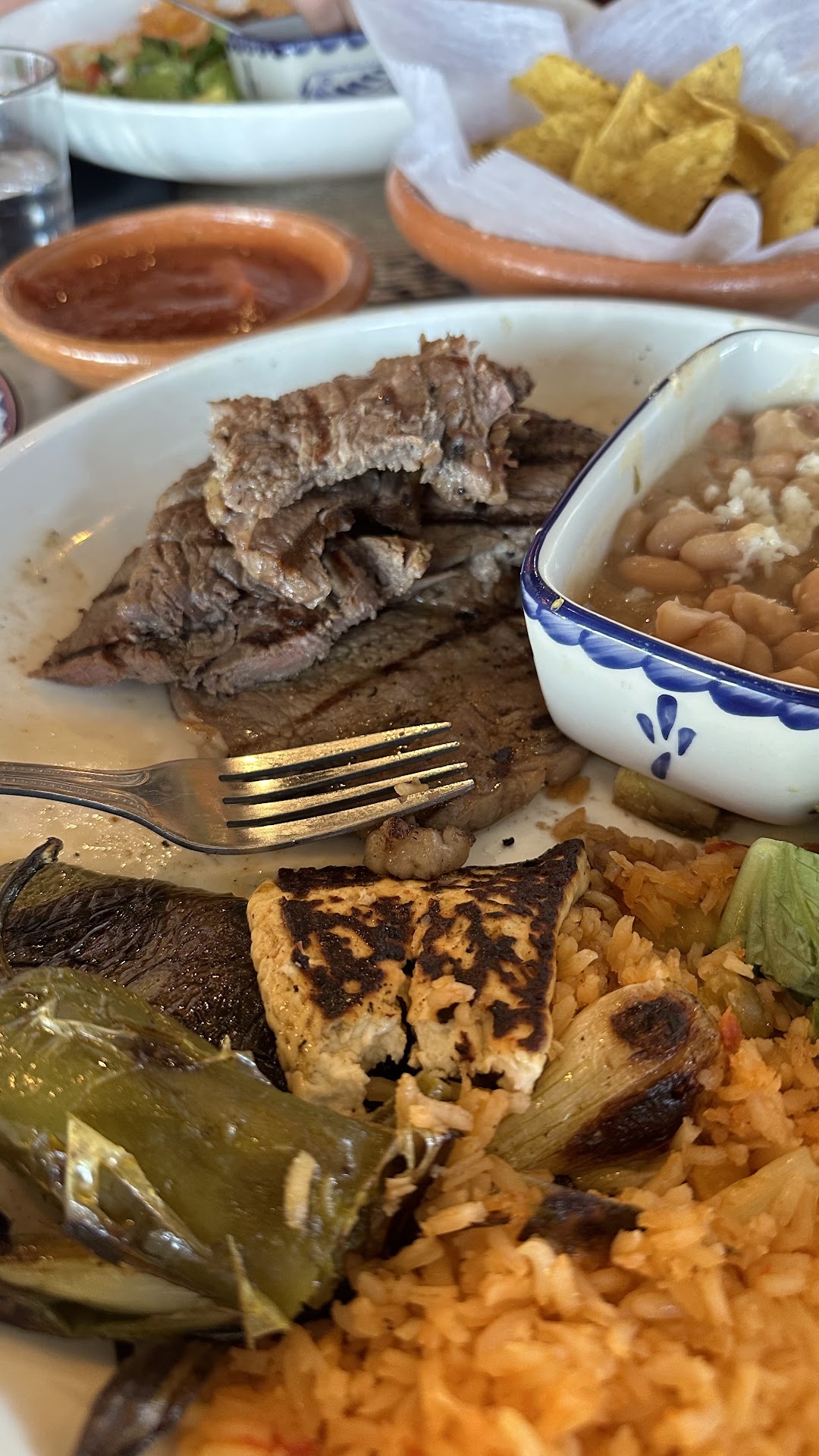 Food: I have never had more bland mexican food than this place unfortunately. The dishes were priced 1.5-2x more than typical sit-down mexican fare, yet portions were a bit smaller and way less tasty. Think $17-35 as an average for the dish. I tried several dishes: arroz con pollo, carne asada, carnitas, and birria tacos. The server asked how I wanted my steak (carne asada) cooked; I said medium rare. The steak I got back was cleared grilled in 1 inch thick planks, which is impossible to get medium rare. So I was confused as to why I was asked if that’s how the steak would be prepared. The carnitas were so dry and had no flavor, despite the menu claiming slow-roasted and marinated preparation.