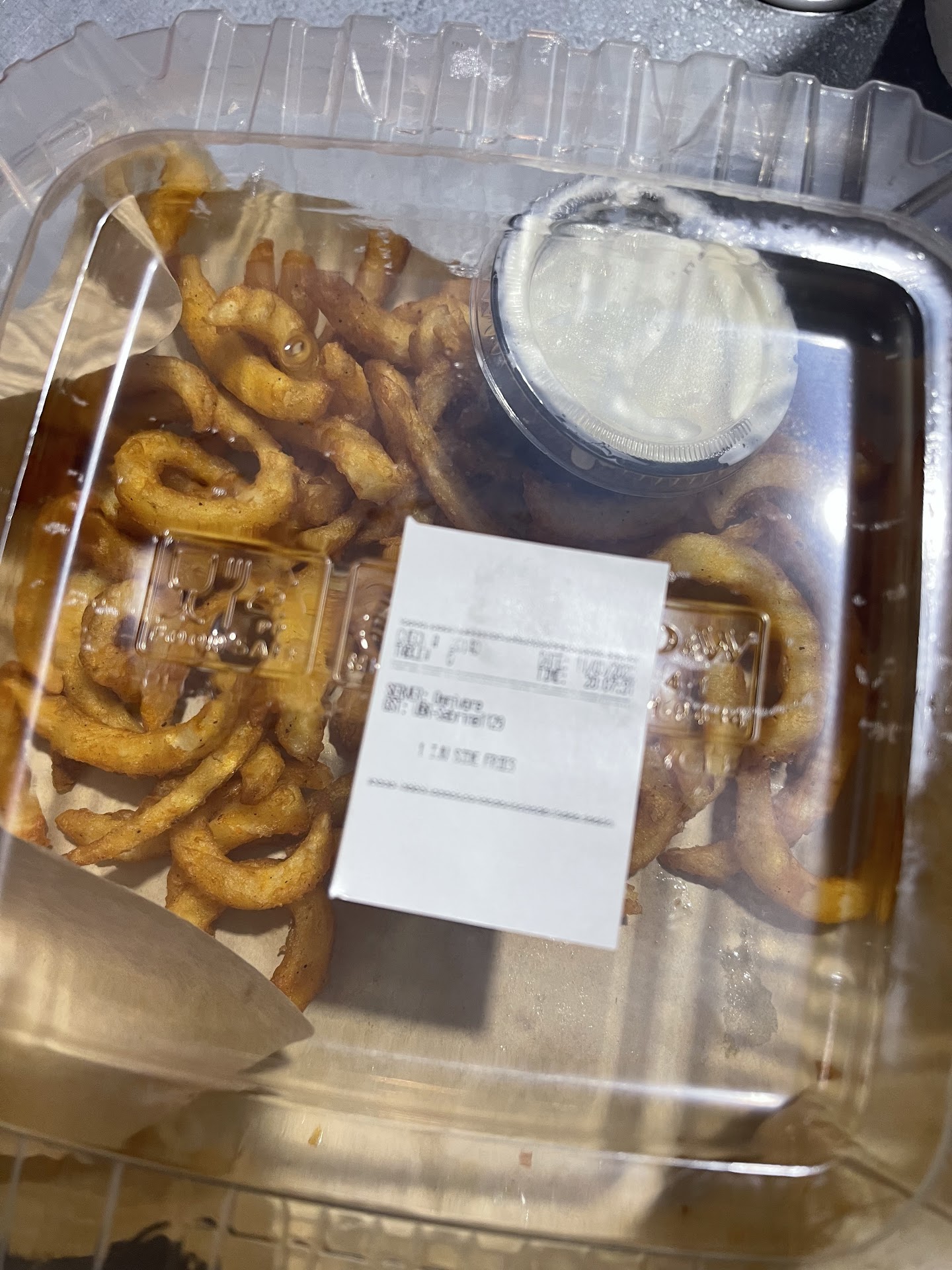 One redeeming factor is that I'm a sucker for curly fries. They were decent. Since it was to go they got steamed in the to go container and were really soggy, but we stuck them in the oven and...