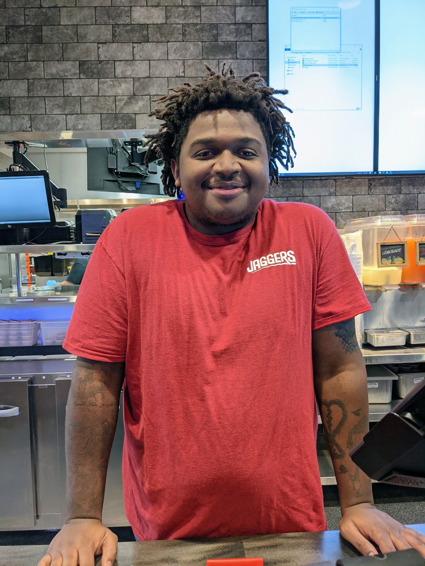 This is my first time ever at any Jaggers. I decided to come inside instead of drive through. Walking in, it wasnât what I expected. In some ways, it reminded me of a pub. Flat screen televisions located on every wall, tuned to different channels with the sound turned off. Music (contemporary rock/pop/alt) played at a comfortable level - not too loud.
