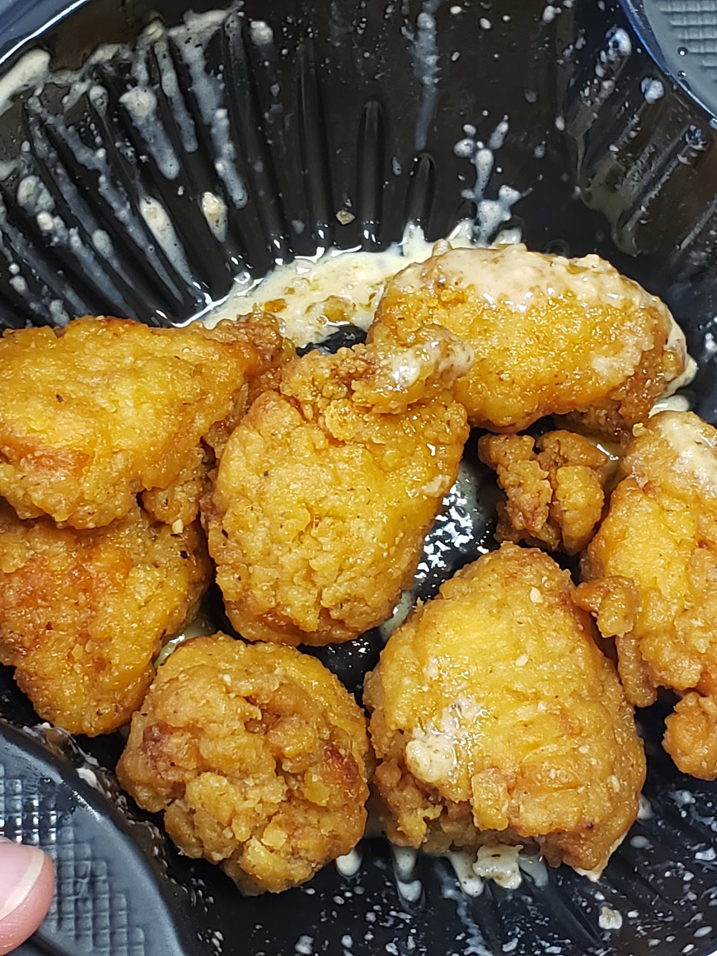 Today, same wings, and the breading tasted like they had been heated after being fried. Sat under a warming lamp long, popped in the oven, or refried. I'm not sure what the a actual cause was, but they hurt my teeth. There was no sauce on the wings, only a little in the crease of the container (see picture). I had to remove the outside breading and press the wings into the tiny lil bit of sauce to try to get any flavor. Very...
