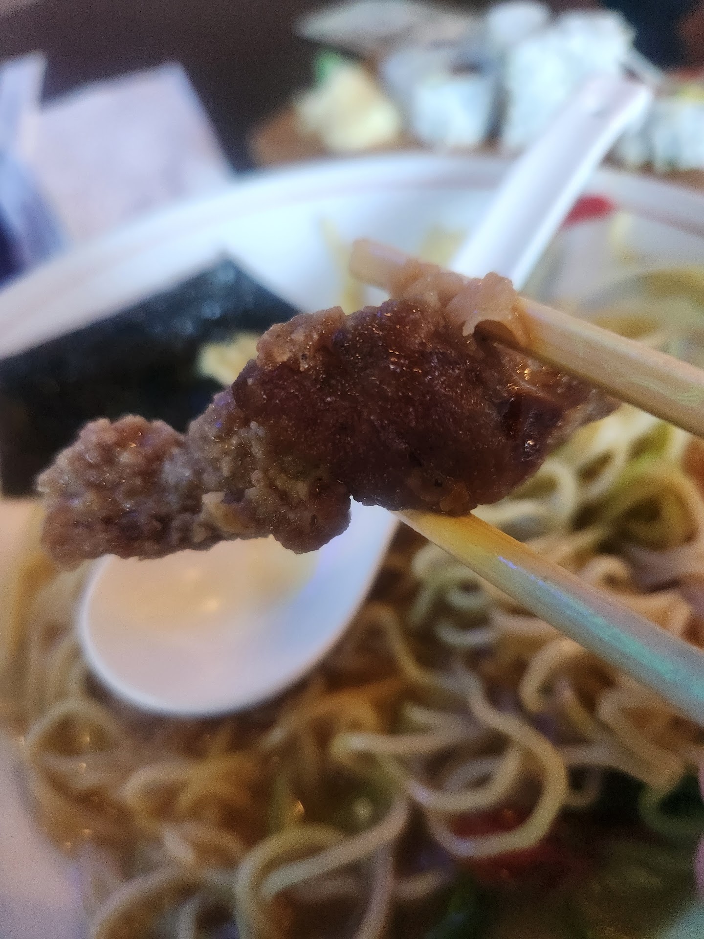 Read moreEdit, 1 star thanks to food poisoning. I really appreciate that my kid is throwing up now. Thanks! How can you fail so badly? Maruchan with the flavor packet put the Tonkatsu to shame. Words cannot express how HORRIBLE this food experience was. The store is clean and simple. The staff was very pleasant, but inattentive. The noodles were like undercooked thin spaghetti noodles, flavorless broth. The ingredients were decent, the eggs ruined-obviously had sat out for a LONG time after being cooked. I have no clue how old the chicken in the picture was we literally cut it open.and couldnt find any meat in it. Yes that's the chicken?! This was the worst meal I have had at a restaurant in years, if not my entire life. $60 and time I can't get back! When I told the wait staff about the food, she brought me my check and made change. No attempts to remedy, or...