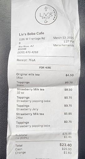 I love Liv’s! It’s my favorite and only local Boba and coffee shop in Nogales, and I love stopping by when I’m in Nogi visiting my parents from Tucson. Our favorite is coconut milk tea with coconut milk and popping strawberry...