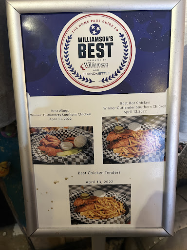 Read moreThis is a "no-nonsense" review, from a huge chicken tender/wing lover. I have traveled the USA and had many variances of chicken and there are some great ones, but Outlanders is one of the best that I have found. I love the small little dive type building, but don't be fooled....the place is amazing. The quaint old building, to the fun decorations, to the old vibe of feeling like I am at a small hometown business in "nowhere" Indiana. This place has great chicken. Fresh. I mean very fresh. I have been many times over the years and Outlander never disappoints. My adult kids say it's better than any chain that you hear of and when they are in town it is a must stop for them at Outlanders. Don't even try to compare Outlanders to Buffalo Wild Wings, Raising Canes, Zaxby's, Waldo's, Maniac's, McDougals, etc., they don't even stack up to Outlanders. Brian Summers has built a small town business that the locals love, and the out of town people wish they had in their hometowns. The staff are young, friendly and service is great. Best of all, he supports all the local organizations, schools and...