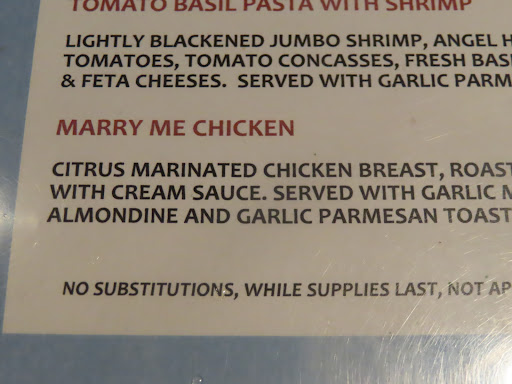 The seasonal menu had something with a fun name called the "Marry Me Chicken", maybe because it's so good you want to marry it?