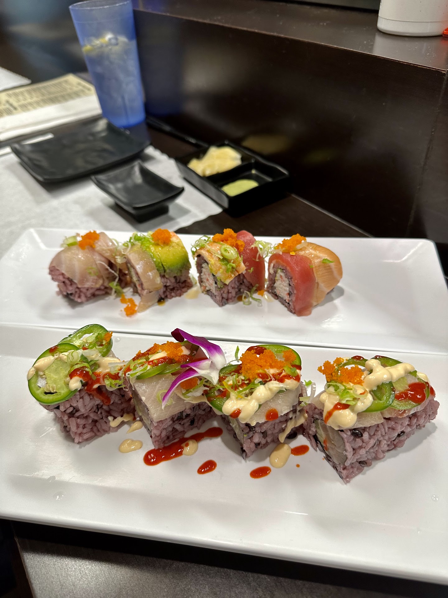 The food was in a league of its own. While the purple rice is a beautiful touch of personality that pulls you away from the atmosphere and pulls you into the food, the taste and freshness just before a tuesday dinner rush was better than other sushi restaurant's I've eaten at as far out as Redlands.