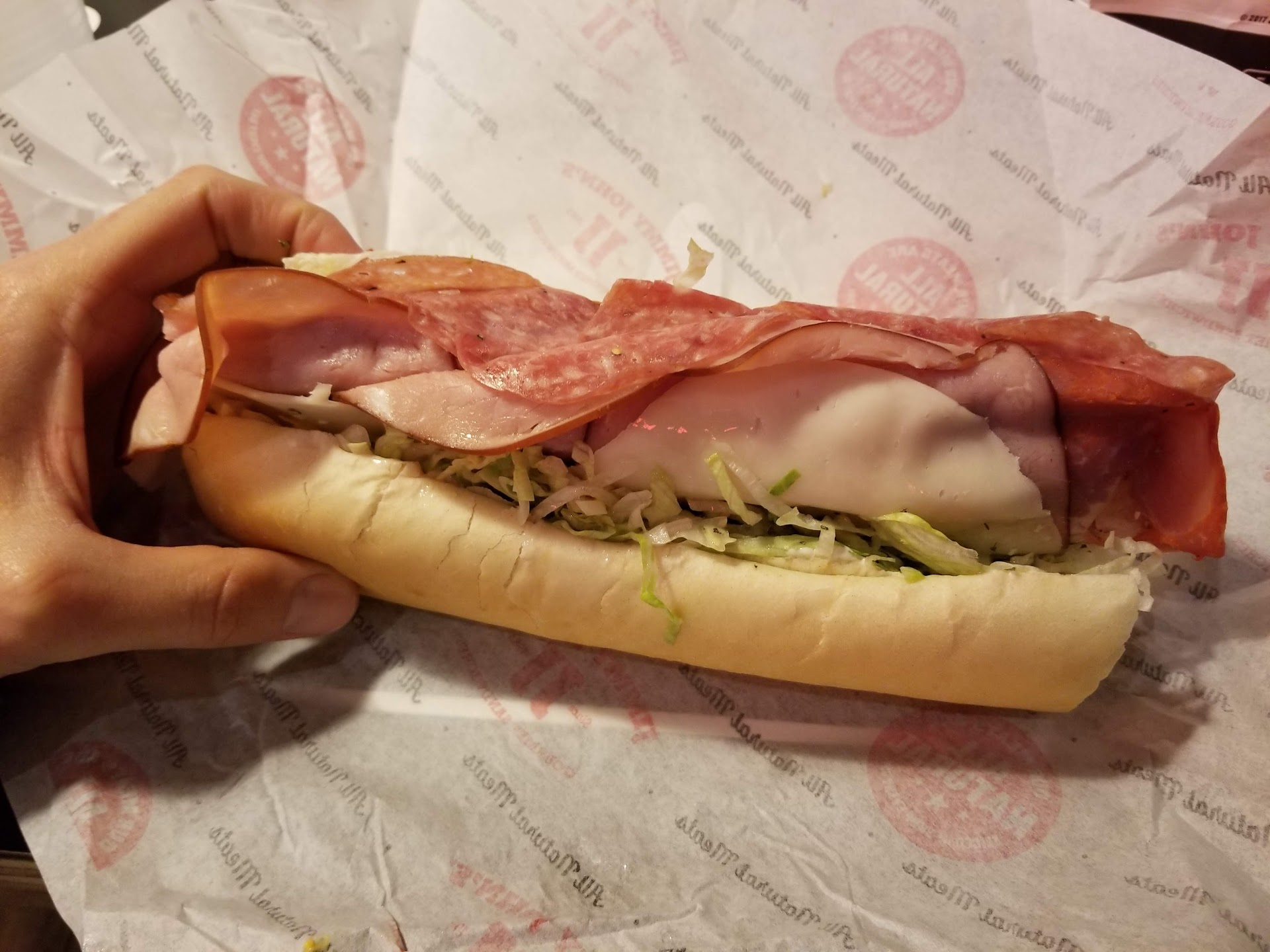 I stopped here for lunch the other afternoon. I had not been to Jimmy John's for a very long time because I did not live close to one. In the past I used to eat at Jimmy John's quite often. I would always get the gargantuan on the regular bread not on the French bread. This time I got the gargantuan on the French bread. When I get it on the regular bread it seems to be a larger sandwich. I always get extra oil and extra Mayo, extra tomatoes and on the French bread it was a lot soggier than on the regular bread. The sandwich was still good and it took me three meals to eat the whole thing.