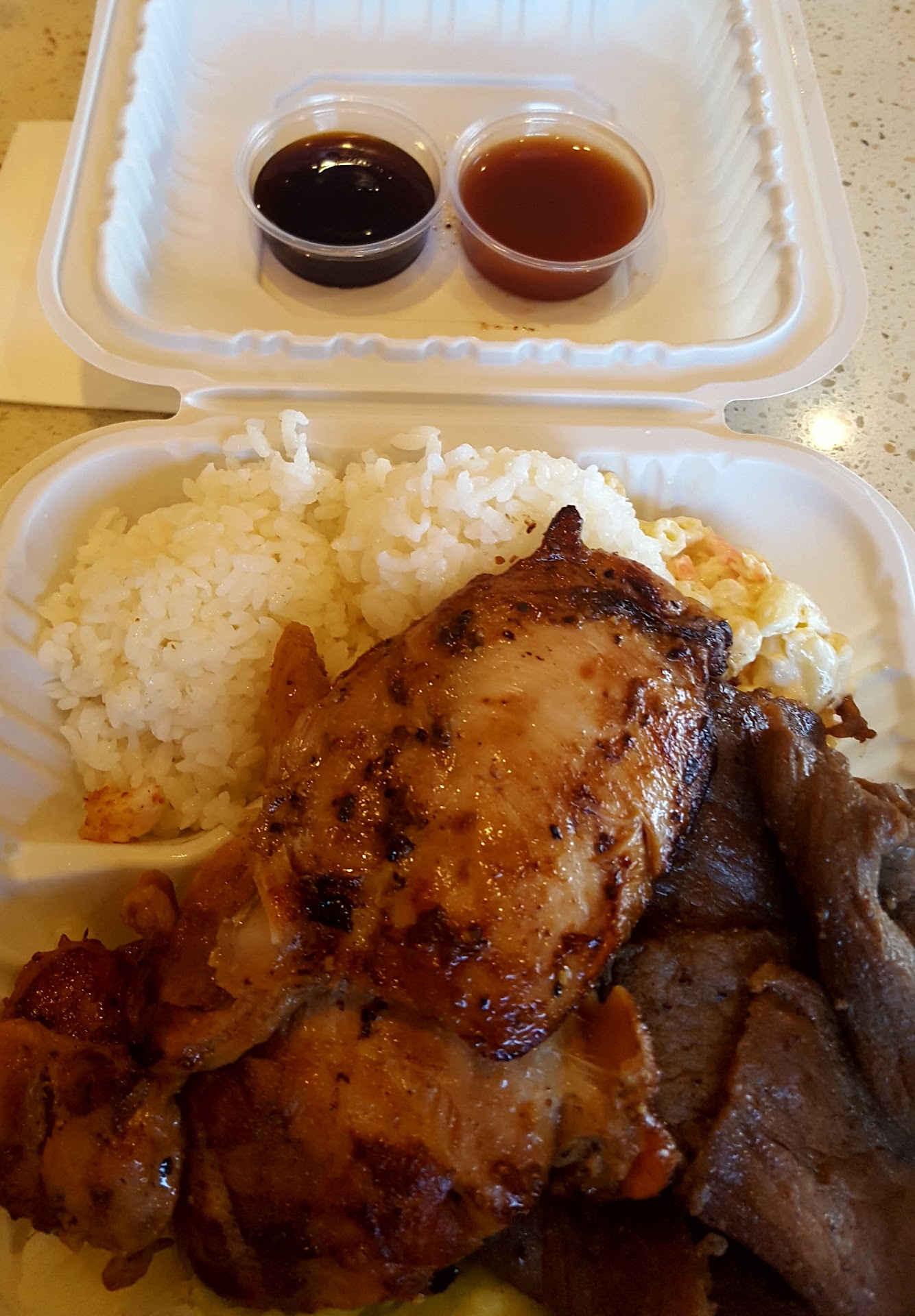 Went to this location about 10 mins before closing. Girl at the counter was very nice and friendly. She gave me an extra bag for my sauce containers. Food was ready with till closing, and a couple had just come in that they were happy to help. Customer service is definitely not where this place falls short, unfortunately it's the food. I ordered the kalua pig with teriyaki chicken plate and kalbi for my better half. First off my hubby's ribs were at least a quarter fat, plus the bone didnt leave much meat. Not enough mac salad for my liking on a plate lunch/dinner. Not to mention this isnt your traditional hawaii mac salad..but I wont go there. 😊 The vegetables were too much and not cooked well enough for my liking. My plate, same issue with preparation of vegetables, however I would have muched preferred some sautéed cabbage with my kalua pig. The kalua pig was short some flavor and could've used a bit more smokey flavor. Of course, I am very picky when it comes to kalua pig. Growing up in Hawaii the hotels would have a competition every year to see who made the best authentic kalua pig and I would get to taste straight out of...