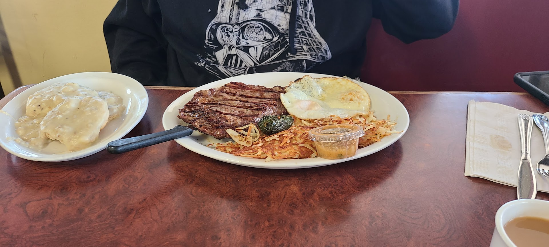 Once seated, I started with a cup of coffee, which was flavorful and just what I needed. The menu had plenty of options, but after a few minutes of deliberation, I decided on the country omelette, packed with ham, bacon, and sausage, all covered in gravy, along with a side of potatoes and a biscuit with more gravy.