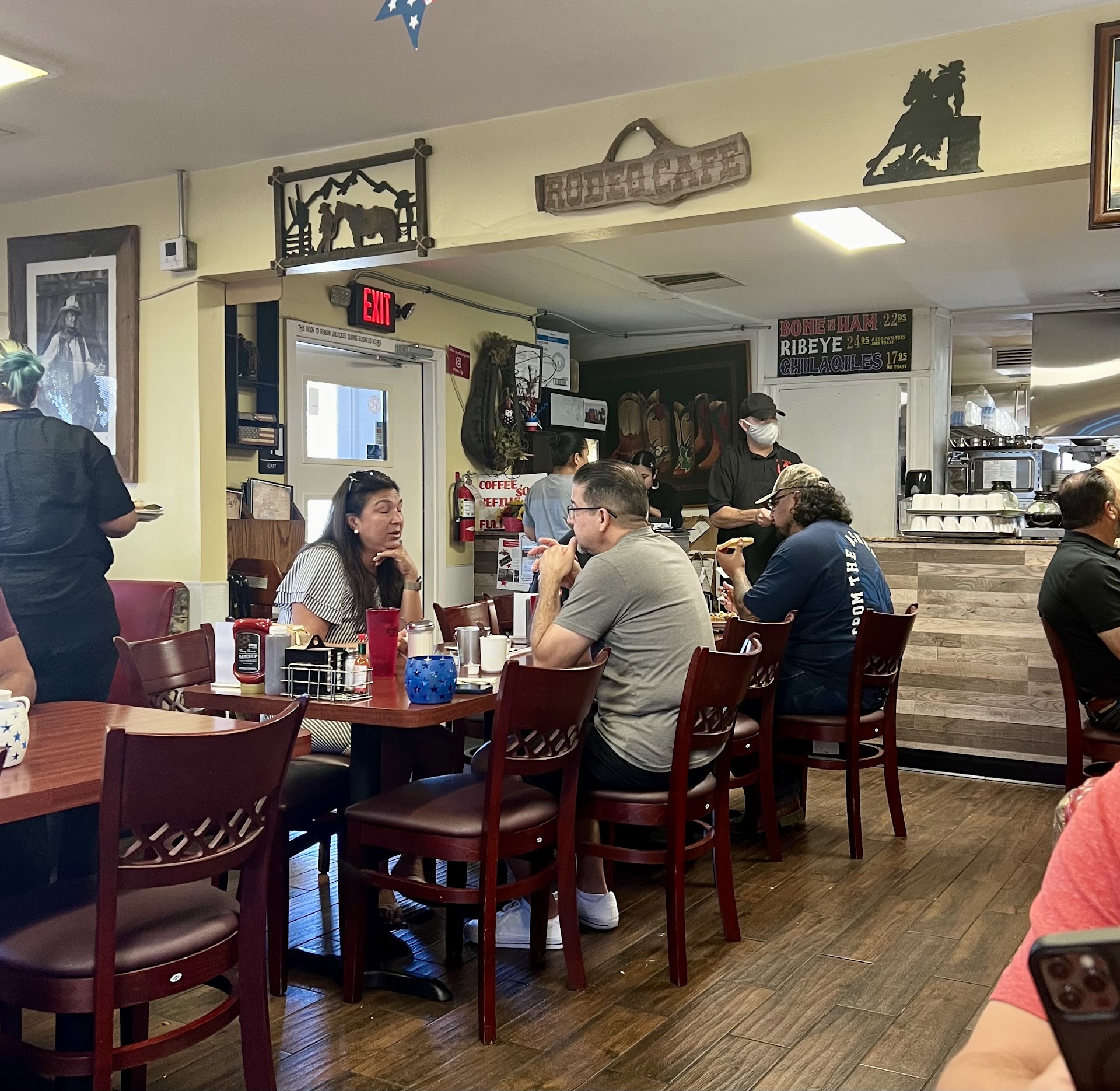 Read moreI heard of Rodeo Cafe through friends and family. It was highly recommended! I was looking for a breakfast place because I wanted to take my fiance somewhere for his birthday to start off his day extra special. He loves horses and I think the western theme is very cute and fits the neighborhood that it is located in. Unfortunately, no horses this time around but there's always next time. Anyways, the breakfast was very good. I ordered the chilequiles verdes and my plate came with the chilequiles of course, homestyle potatoes, eggs, and beans. The chilequiles were perfectly spicy, and had flavor! It tasted like they used real, homemade chile verde. The beans were good and so was the egg, but the star of my plate was the potatoes. The potatoes were so good, very savory with crunchy bits of goodness. My fiance got a ribeye steak and eggs plate. He loved his food and how tender the steak was. We both got an order of biscuits and gravy as well, which were also good. I hate when the gravy is too salty, but this gravy was perfectly seasoned. We got coffee with our breakfast and I'm so pleased to say that our cups never went empty. âď¸ I'll be back if I'm ever in the neighborhood, it's a little far from me with traffic and everything but worth stopping by if...
