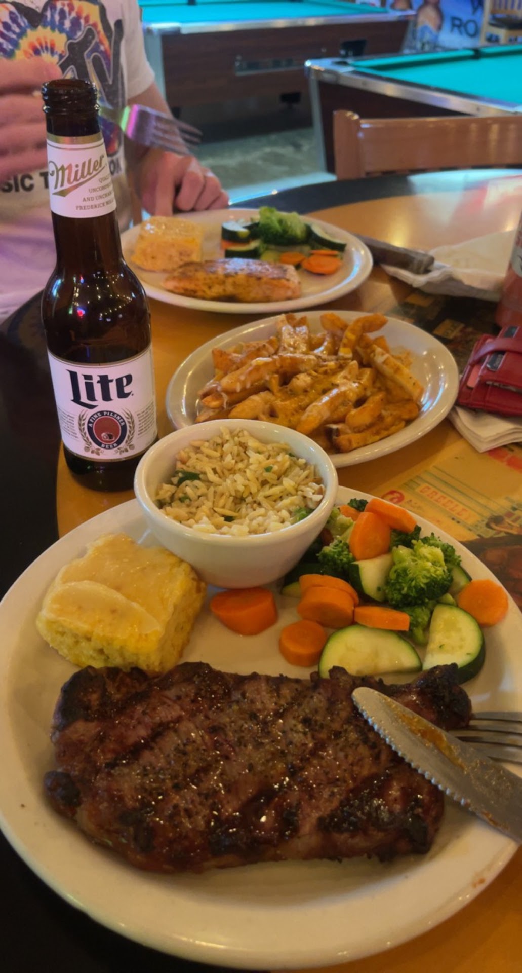 Read more7 out of 10. Food was tasty. Would like to have given 4 stars but I'm picky. Great steak dinner special on a Saturday night for $10.99. I would have given a higher score except for a few small set backs in service. We ordered an appetizer and it came out with the entrees. I wish I had ordered it first then ordered entrees after a few minutes. Also, it seemed like they left our food sitting in the window too long because the steaks came out luke warm. My husband's potato was hard, had to ask for another. It's a good thing every thing tasted good. Good spot for bar type food. Burgers, salads, fried pickles. Manager was a little short when we asked for a new potato but was much more courteous when he came back around. Maybe he realized we weren't just trying to get an extra potato after he saw for himself it really was hard. Hard working servers. Busy spot. Just don't expect the type of service you get in a corporate restaurant. It's a mom...