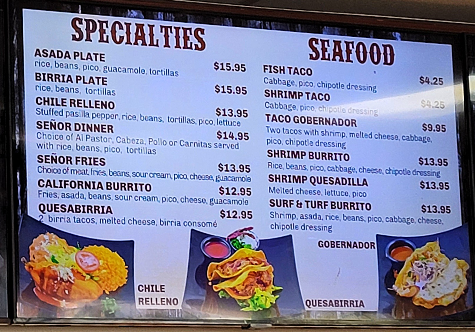 Food is bomb and prices are decent (everything is expensive now) love their red sauce as it's reaaallly spicy and flavorful. Nachos with real cheese and if you get anyone but the tall old guy the bake it a couple of times which makes it soo much better. Menudo, best ever. I see people bringing their own large pots a d ordering many. It's crazy. They serve alcohol and have some tvs.
