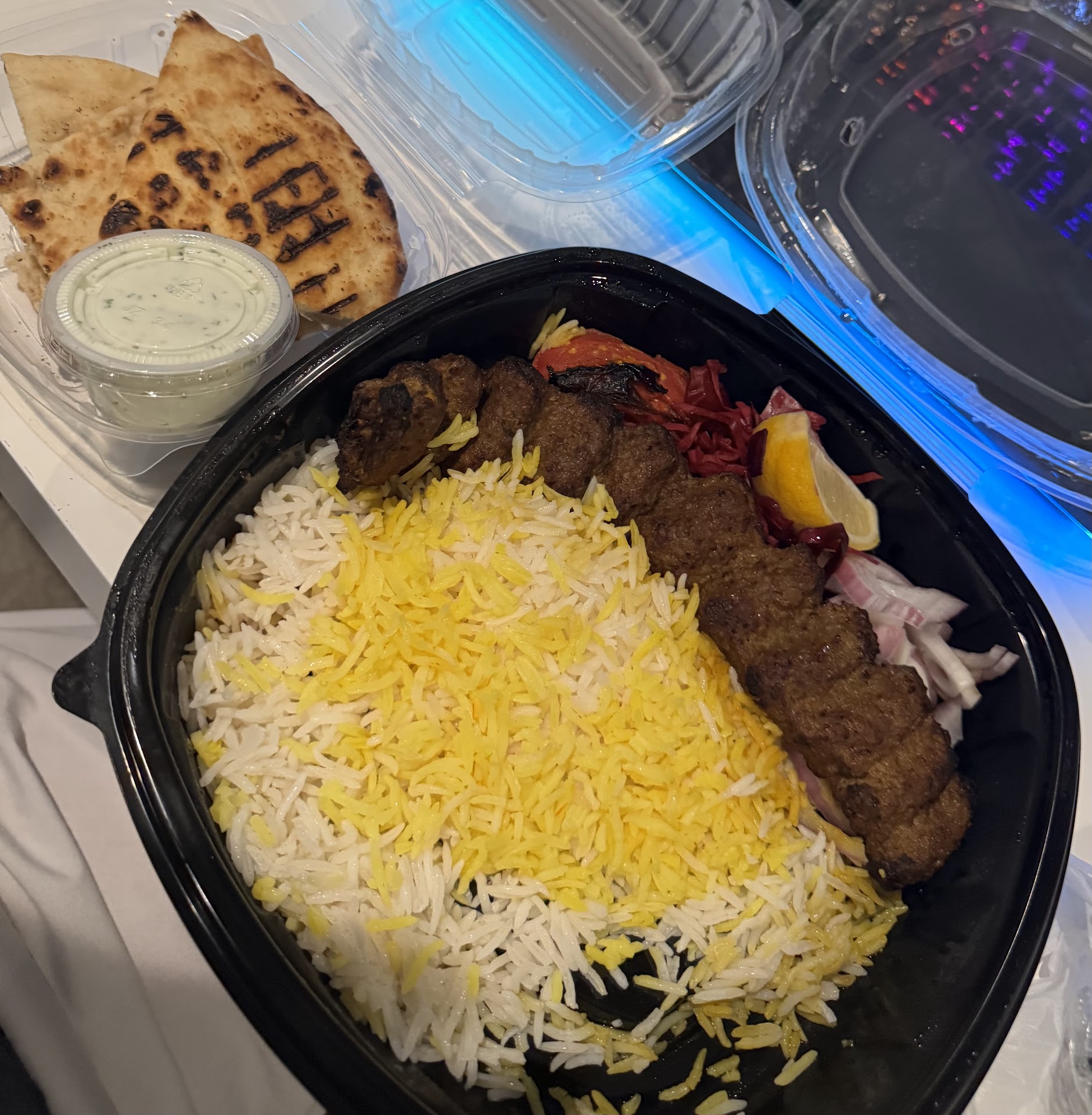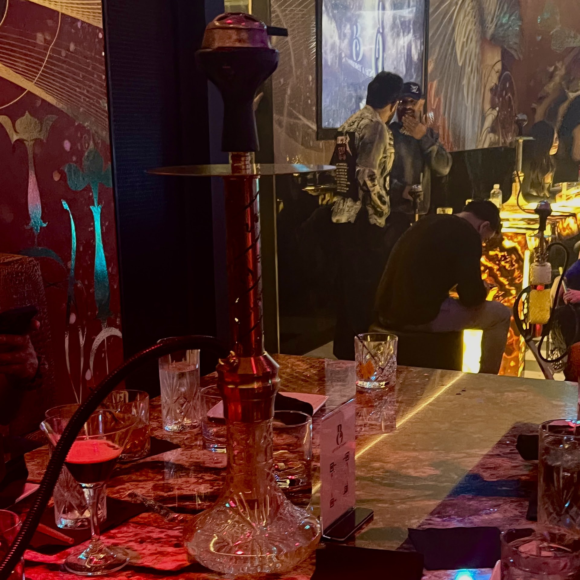 The inside is really nice, great lighting and great music. We sat at a table and the chairs were super soft and swiveled, almost like a living room armchair. The cocktail list was great - we got the filthy martini and a mojito and started off with hummus and baba ganoush that were absolutely delicious. More cocktails and we split the beef solvani (insanely good) and then ended the night with hookah. The music was really great, there was a dj but the volume was not super loud.