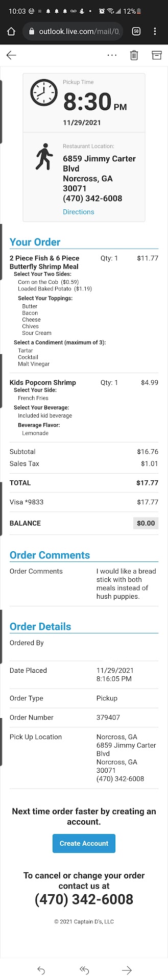 Read moreI placed an online order on Nov 29. I received a confirmation that my order would be ready at 8:30 pm. There was a line in the drive thru so there was a wait. I was asked to hold once I reached the speaker. When they came back I told them I had an online order. They said drive around. Again there was a wait until I reached the window. He calls out an order that was not mine. I repeated that I have an online order. He goes to check and comes back and says he doesn't see my order and asked if I had the right location. I showed him my confirmation. I told him it's on the confirmation I just showed. I showed him again. He says that I have the wrong location because the zip code is 30071. I said no this is the right location. I asked why he doesn't know the location of where he works. He says he's not from here. He leaves the window again and speaks to someone out of view and looks at a bulletin board. He comes back and asks what did I order so he can make it. He asks for help ringing my order since I already paid for it. Someone comes from the back and tells him he can't do that because it's a franchise. This person was supposedly a manager by the name of Ike. He asked where I placed the order. I said on the Captain Ds website. He said that is a 3rd party website and they have no control of orders not showing up. I explained that my card has already be charged. He said the only thing that could do was ring up the order and have me pay again. I would have to call tomorrow to dispute it. At this point it was almost 9 pm and past my child's bedtime. Even though I had an email confirmation and my account had already been charged I had to pay for the order again. This is really poor customer service. As a customer I should not have to be charged twice because of their system error. They couldn't even provide me with a number to call. I will have to dispute the double charge with my bank. This location needs to do better. They can start by learning their...