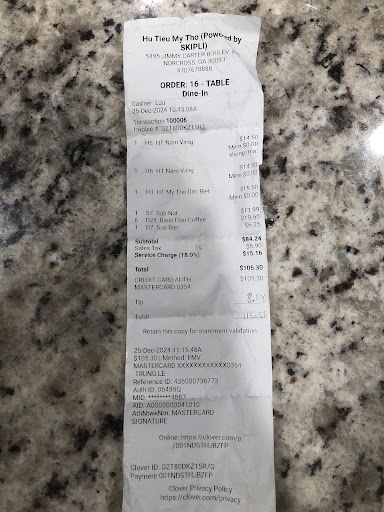 Read moreMy family recent came here because they have better foods than the past. However, the services were terrible. Last 5 day, we called about 7:00 pm to picked up foods. When I came about 7:20pm to picked up, the short guy in front desk had an angry face, not any Hello, any question to me, and absolutely not any thank you after that. Today we came in for 4 people, one 4 year old kid. We ordered 4 rice noodle bows. And then we bought Flan cake + 1 corn milk to go. And still the short guy( I'm not sure his name is LUU?) checked out without gave me any information or amount. Then he charged total $84.24 PLUS Service Charge(18%) without asking me or let me know about that extra for service. I still left 15% Tip more ask $8 because I did not know they charged 18% already as $15.16 included to go foods( $19.5 + $6.25= 25.75). Be carefully when you come here with your family, Just pay with asking any tip or extra service charge include and you don't mind that no one...