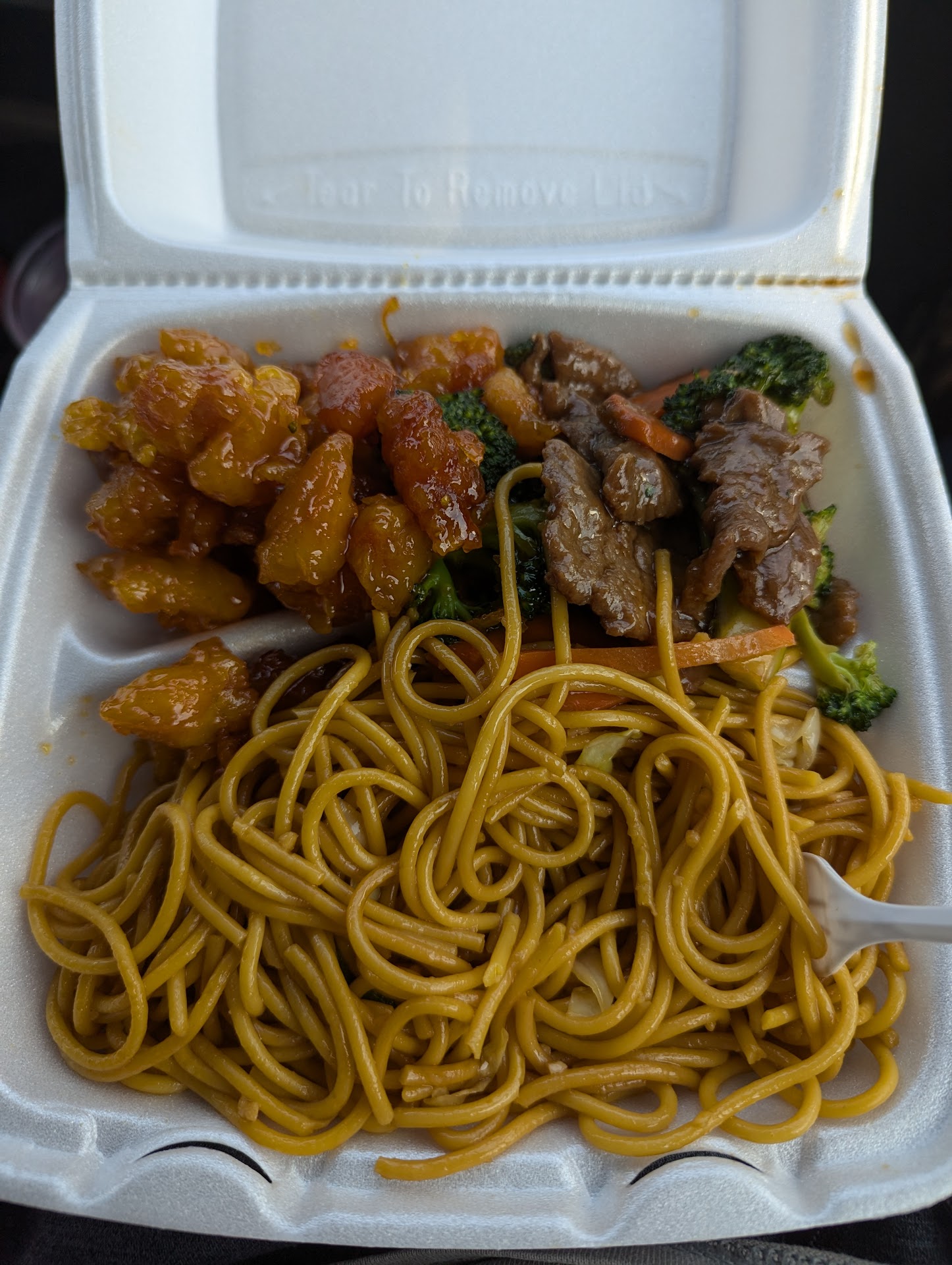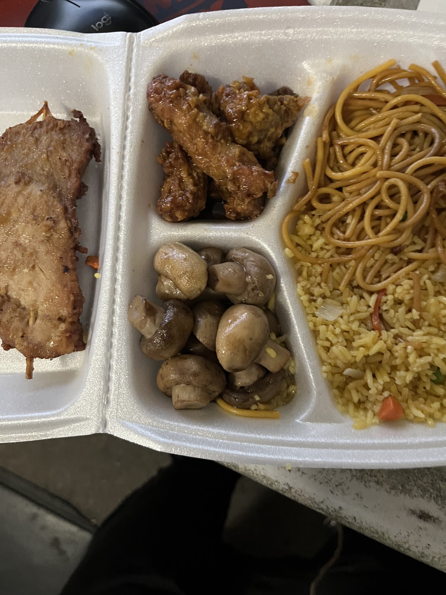 I was not greeted just a rude employee that said āwhat do you want?ā Then after I told her I was looking to see what else I would like she scooped some of the food out of the box thinking I didnāt see, then added the rest of the items, I ordered general tsos chicken, rice, noodles, and mushrooms then a chicken on a stick. She closed the lid and I then got an egg roll. When I went to pay she charged me $23.78 .. I thought that was quite high for a tray/box that skimpy. Got home and when I went to eat it I couldnāt believe how little for that amount of money it looked. I will never eat at Asian cuisine again. The rice and noodles didnāt even reach the top of the styrofoam edges. Sad because the food isnāt half bad, but not worth the price. Pathetic that the restaurants in this town charge so much for so little. See pictures...