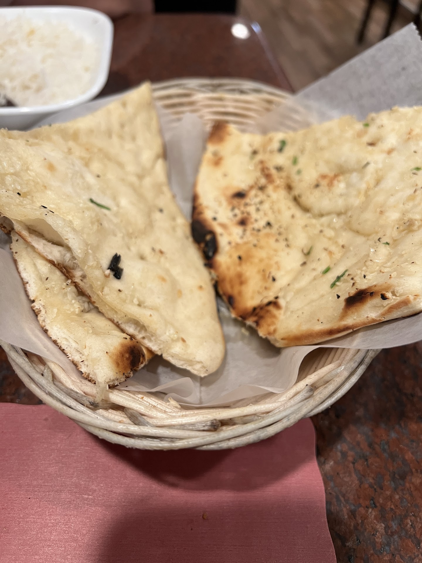 I can only speak to the quality of the chicken korma and naan. The korma gravy lacked that bright, aromatic quality I expect in a restaurant curry and felt sort of gritty instead of creamyānot enough nuts maybe? Canned ginger and garlic instead of fresh? The dry spices also had a flat taste. I donāt think theyāre using whole spices and grinding them. It tasted like they used an old packaged spice mix from Shan or something. The naan looked and tasted like they buy it frozen and bake it at the restaurant. Itās very thick, dry, and uniform in shape. The chicken itself was good, though. Tender chunks of dark meat.