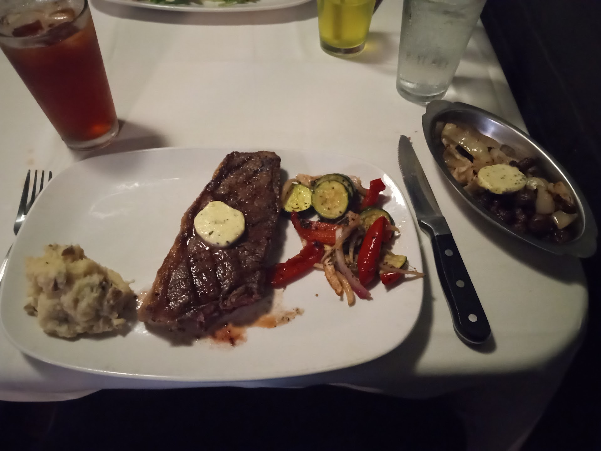 My mom ordered a filet mignon, cooked medium with an additional mushrooms and onions to top the steak along with a garlic mashed potatoes and a medley of vegetables. All sounds great, doesn't it? The steak arrives and it is dry, flavorless and cooked extra well done. The mashed potatoes and vegetables are cold. When she cut into her steak and showed the server it was overcooked, he said "I will get you a new steak right away".