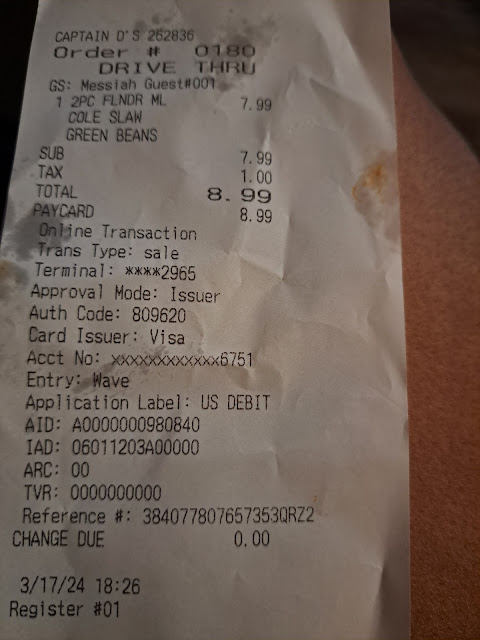 My husband and I had been craving Captain Dās. We finally located one!! Yay! Or at least we thought. After waiting in the drive thru line for approximately 40 minutes, we were asked for our order and immediately told to wait. After another 10 minute waitā We were asked for our order in a rude manner ā as if we were an inconvenience to the worker. My husband placed an order for two fish platters, a Childrenās chicken mean with sides of macaroni & cheese, coleslaw and green beans. We pulled up to the pick-up window and they took our payment. Without a word.