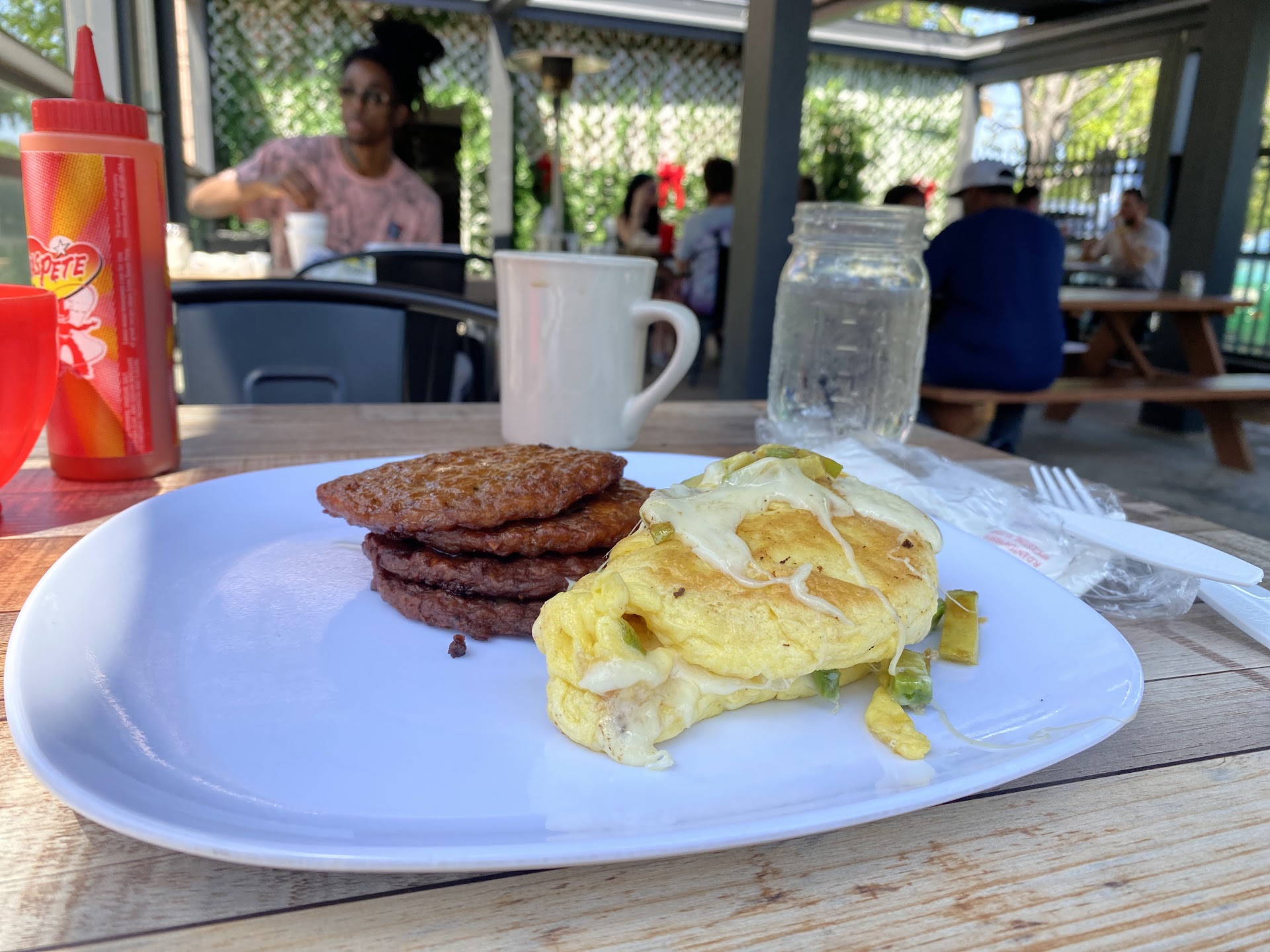Once we got past that, we were told to go into the back glassed patio area for seating. I’m guessing they are very proud of this area being they decided to turn the old charming dining area into a messy college dorm room. Not a bad space, but rather warm being it was 80 deg. & sunny at 10AM. They did have a large fan running in the corner, but we were not getting much breeze from it. Back tracking a bit….. It was nice inside with the air conditioning, but alas…no seating in there.