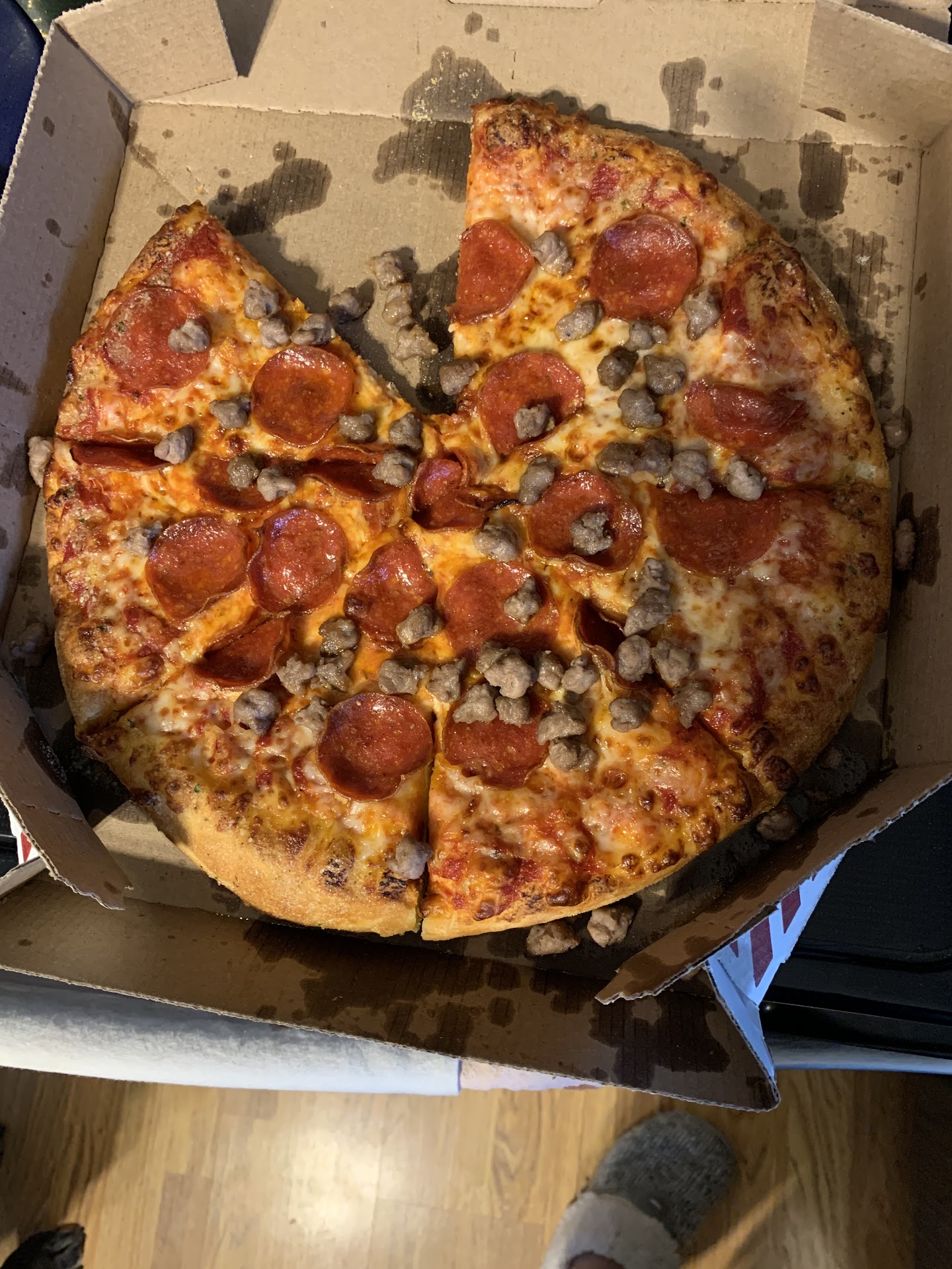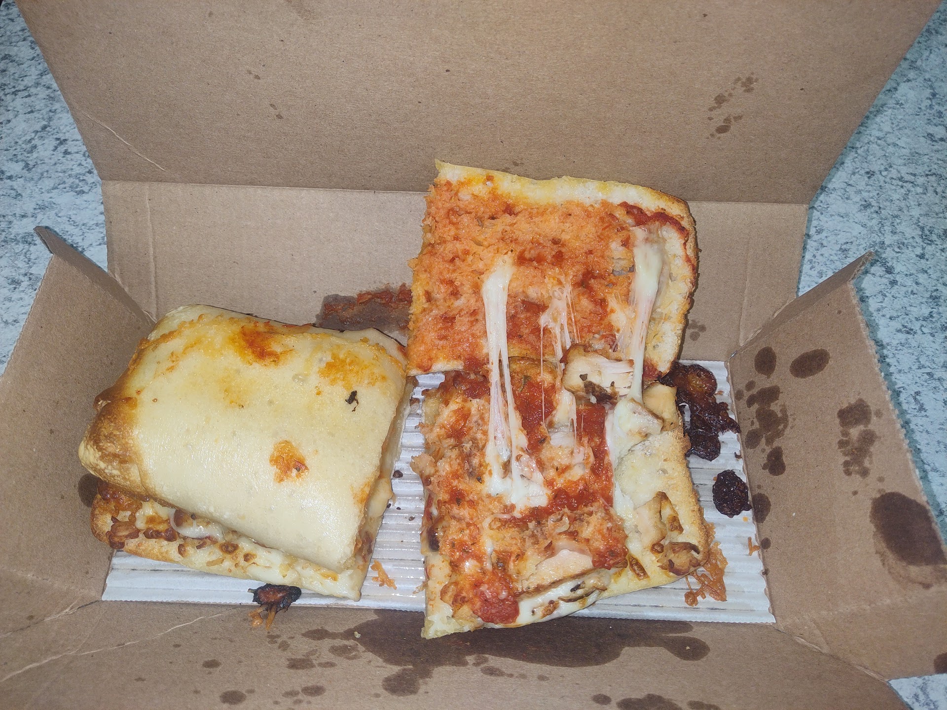 Asked for the pizza without all the extra added greasiness... It still came that way. The pizza also wasn't cut into slices at all. The sandwich was extra greasy too, and barely had toppings.