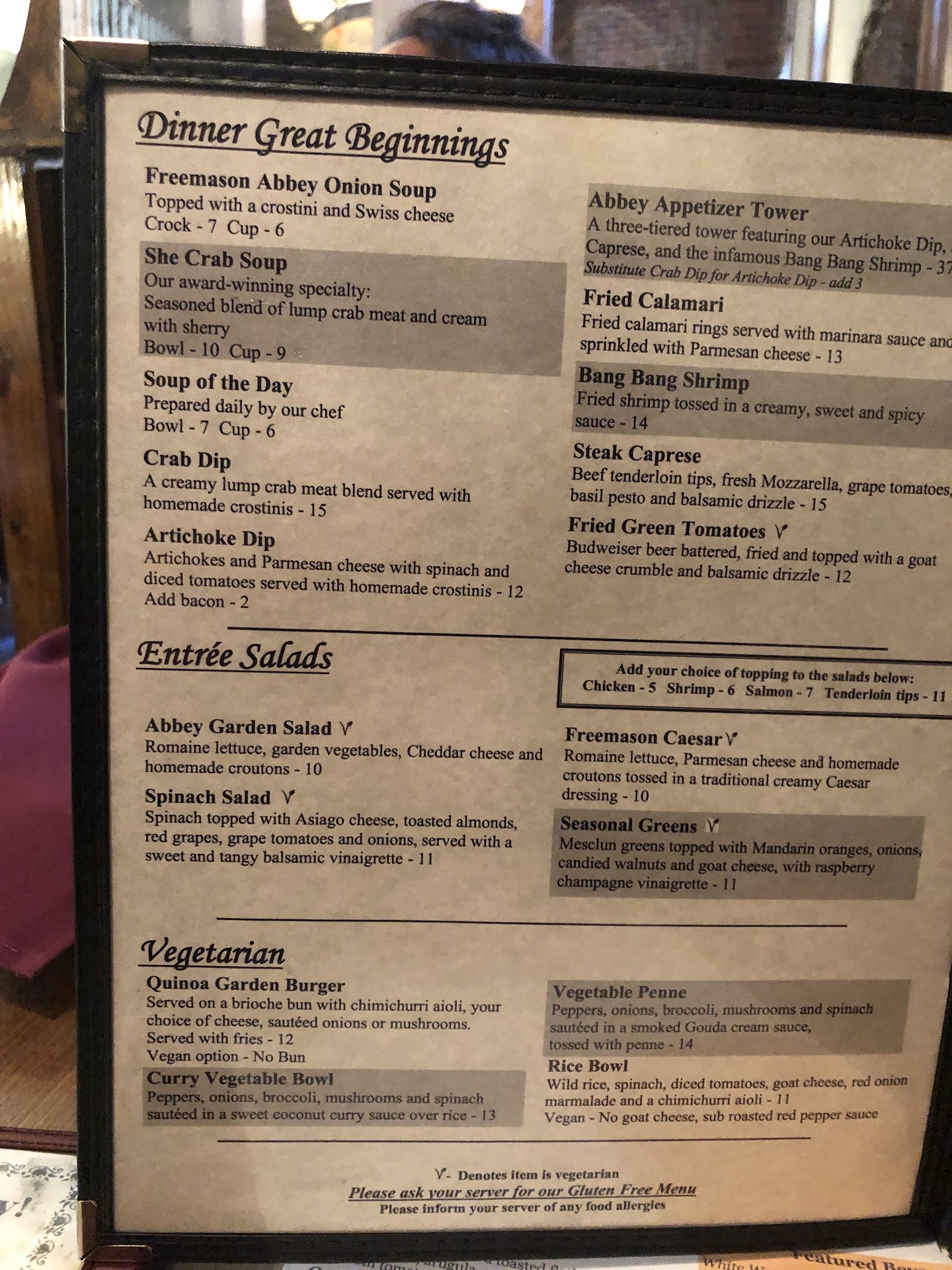 Read moreCame at around 4pm for dinner, restaurant was fairly empty and staff were very friendly. Our server was great, lots of energy and attentive. I have no complaints about the people working here, they were great. The atmosphere leaves something to be desired. I get trying to preserve the feeling of the old church and the history of the building but dear God this place needs a facelift. Carpet, old creaky booths, cheap foam padding on the seats, and my all time personal pet peeve in a restaurant…fake plants everywhere just collecting dust. It gives old without the charm. The food. Oh boy. The “fresh baked bread” for the table was clearly premade frozen bread that you can buy at any grocery store and it was overcooked and hard. To add insult to injury, it’s served with butter that comes in those little plastic containers, absolutely not something you would think about for a higher end restaurant and more of what you get at Waffle House. At least give us some actual house-made bread and real butter. Let’s not cut corners there. The French onion soup was good. I’ll give them that. Just good though. I’m still chasing the dragon that was the French onion soup from The Raven back in the day RIP. We had the calamari as an appetizer. It was clearly frozen and either baked or microwaved. Rubbery, mushy, and all around not good. And not sure where they are going with the huge serving of dipping sauce, which was a weird marinara, for about 10 pieces of calamari. We returned it. My husband had the filet mignon, and it was okay. Nothing that would leave a lasting memory. I had the herb butter steak pasta. Again, it was okay. We were hungry so we ate but overall it was lacking. Our bill for two sodas, and two entrees was $73. It would have been more had the calamari not been taken off. If we had tried desert and decided to get adult beverages the bill would of easily been over $100. Which for this quality of food would of been robbery. I am not sure if this was just an off day or if this place is slowly giving up. It’s needs fresh food, fresh decor, and an inject of energy and life. If anyone in management reads this please, please, give this restaurant the attention...