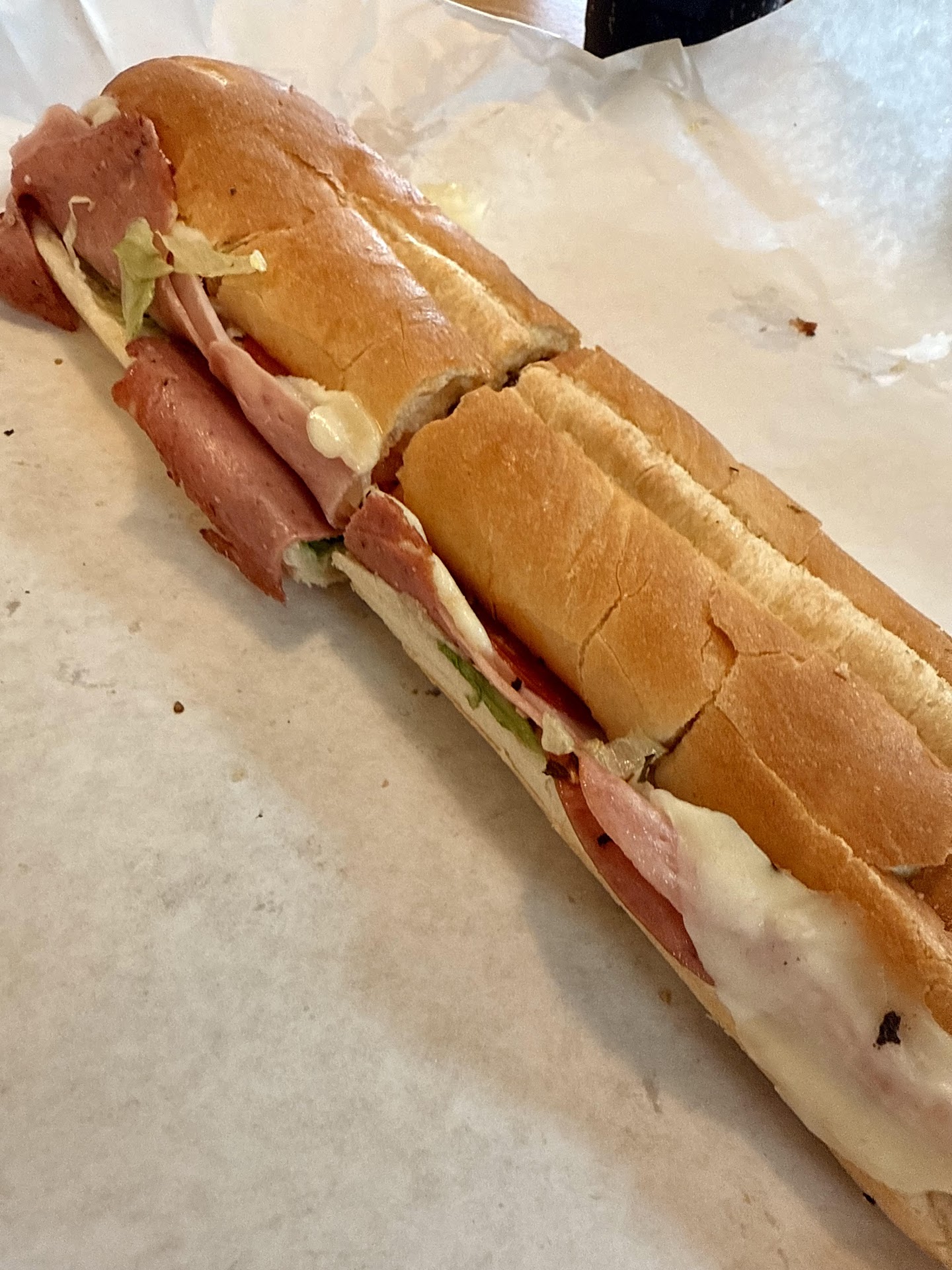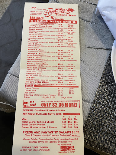 Read moreWe always love the super greater grinder. We have been coming here since I was little so at least a good 30+ years if I had to put a number on it. Lately, most are easy going employees who will make our subs just as we ask (no lettuce, add mayo, sweet peppers, and hot peppers). The past few years we have gone the price is kinda expensive but what hasn't gone up lately and they add a fee for debt/credit cards which is crazy. The last 3 times I have gone in to pick-up (we always ends up getting 4 to 5 subs) after calling ahead I have had a short wait but the shorter African American that rings me up ALWAYS is a pleasure. He says welcome in to everyone who walks in, he smiles the ENTIRE time I am there, is very nice and bubbly, uses his manners when speaking, AND he is that way with everyone even if they aren't as nice back. Some of the folks behind the counter aren't as nice as him and seems to be grumpy or just don't like their job and don't want to be there. I have also heard a few behind the counter conversations and folks on break have conversations and the choosen language is not very appropriate/clean that I feel customers should not have to hear. The other thing I don't really like is that there tends to be groups of people outside the building on the side smoking marijuana and I don't care to smell that nor want my kids...