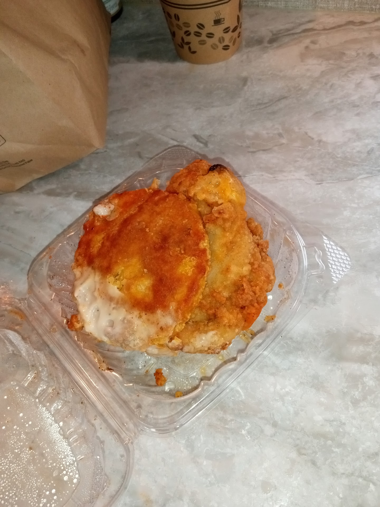 [ ] Hella Fitzgerald ā This is fried chicken with bacon, cheddar cheese, and sausage gravy. I also selected the sweet potatoe biscuitā¦.Here we goā¦.To start, unfortunately, the chicken did not taste fresh. It appeared to be precooked and warmed when ordered. I know freshly fried chicken, and this wasnāt it. The chicken skin lacked a crunch and was soggy. It was tepid and lukewarm to the touch. The bacon was good, though, as well as the sauce gravy. The biscuit lacked the distinctive sweet potatoe flavor I was hoping for, but I could taste a hint of it. The biscuit itself also seemed to be precooked and warmed later. It wasnāt fluffy or flaky. To be honest, Iām not sure what this was or what to call it, but this was not it for me.