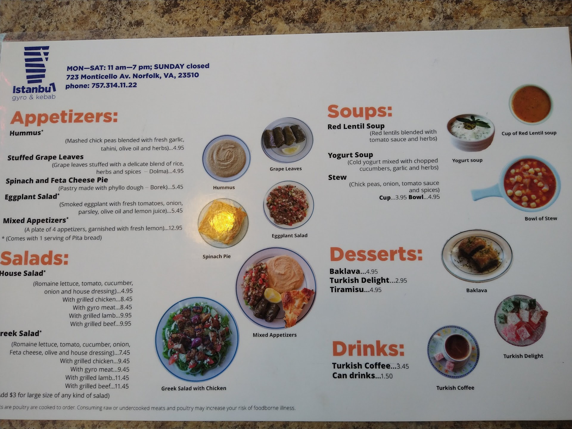 Great place for an authentic Turkish meal! Once you walk in, your happily greeted by an associate at the store. Guess what, he is also Turkish from Istanbul. Hint, hint, restaurant name Istanbul Gyro and kebab! This is not just a coincidence! Lol Now onto the food, I ordered the lamb and beef plate with a side onion salad. I have provided the menu in the pictures. Also the meals are located there too. The meal came out hot off the grill in no time at all, maybe 5 minutes. I also had an appetizer of wrapped grape leaves rolled in rice and spices. The flavors melted perfectly together in my mouth. It was a moment when you just want to chew slowly and savor the pickled leaves flavorings on the rice.