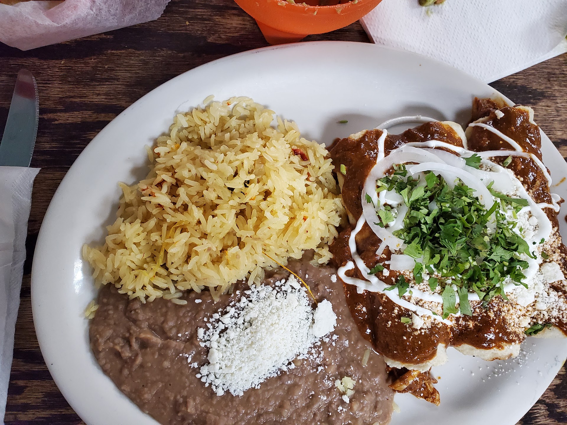 Let's talk about the burrito - the flour tortilla was very thick, and undersized for wrapping. When I picked up the burrito, it was dripping wet to the point I couldn't eat it like a burrito, but opened it and ate the filling with a fork. I understand that veggies are moist, so it would make sense to add rice and or beans to soak up excess liquid and make the burrito edible in the fashion of a burrito. There was a layer of cheese toasted onto the inside that gave nice flavor (but again, not authentic). My burrito was served beside a bed of shredded lettuce and dollop of fresh guacamole.