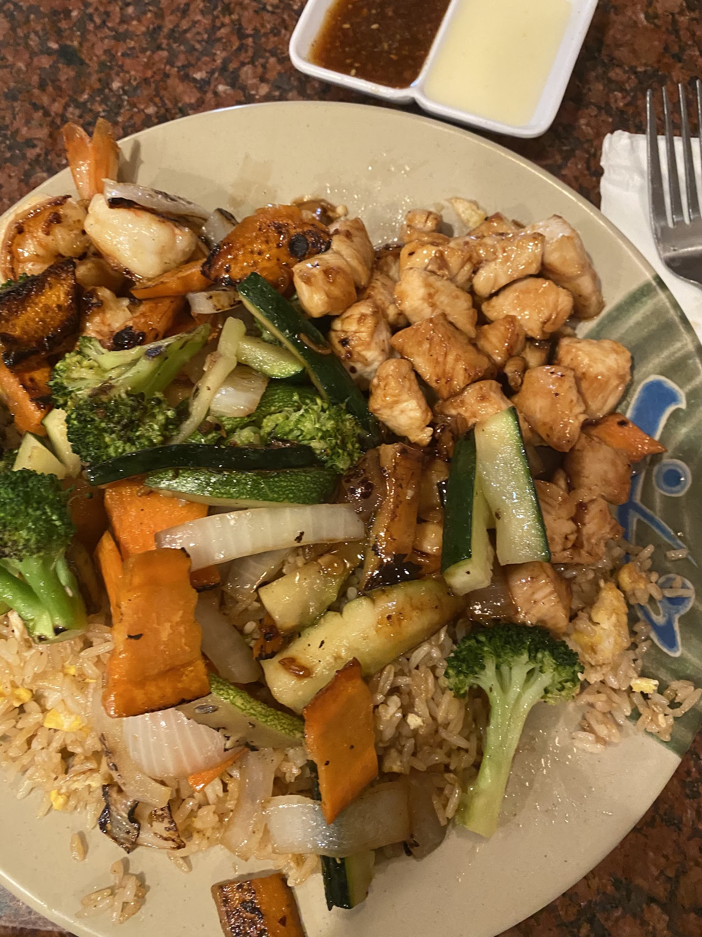 Chef comes out and is dressed nicely so that’s a plus. He confirmed everyone’s order and got to work. His flare wasn’t flaring. He went through the moves as a necessity instead of adding pizzaz or fun antics you usually see during hibachi. He cooked the mixed veg with 4 helpings of oil (minimum) and was quite unnecessary. The rice which we all wanted fried, got two eggs and some soy. I felt like so much more could have been done with the rice. Next he put the chicken on the grill. The following part is what makes me most nervous. He was finished cooking the veg, flipped the chicken after 3m on the grille and then immediately plates us our veg. Cross contamination comes to mind and let’s hope tonight isn’t praying to the porcelain deities. Drink went empty before I found the waiter doing side work to ask for a refill. As soon as the chef was done we were handed boxes. The other party made the comment, “guess it’s time to go?” I felt like we weren’t allowed any time to eat although it’s 8p on a Sunday and not anyone else but our four top here.