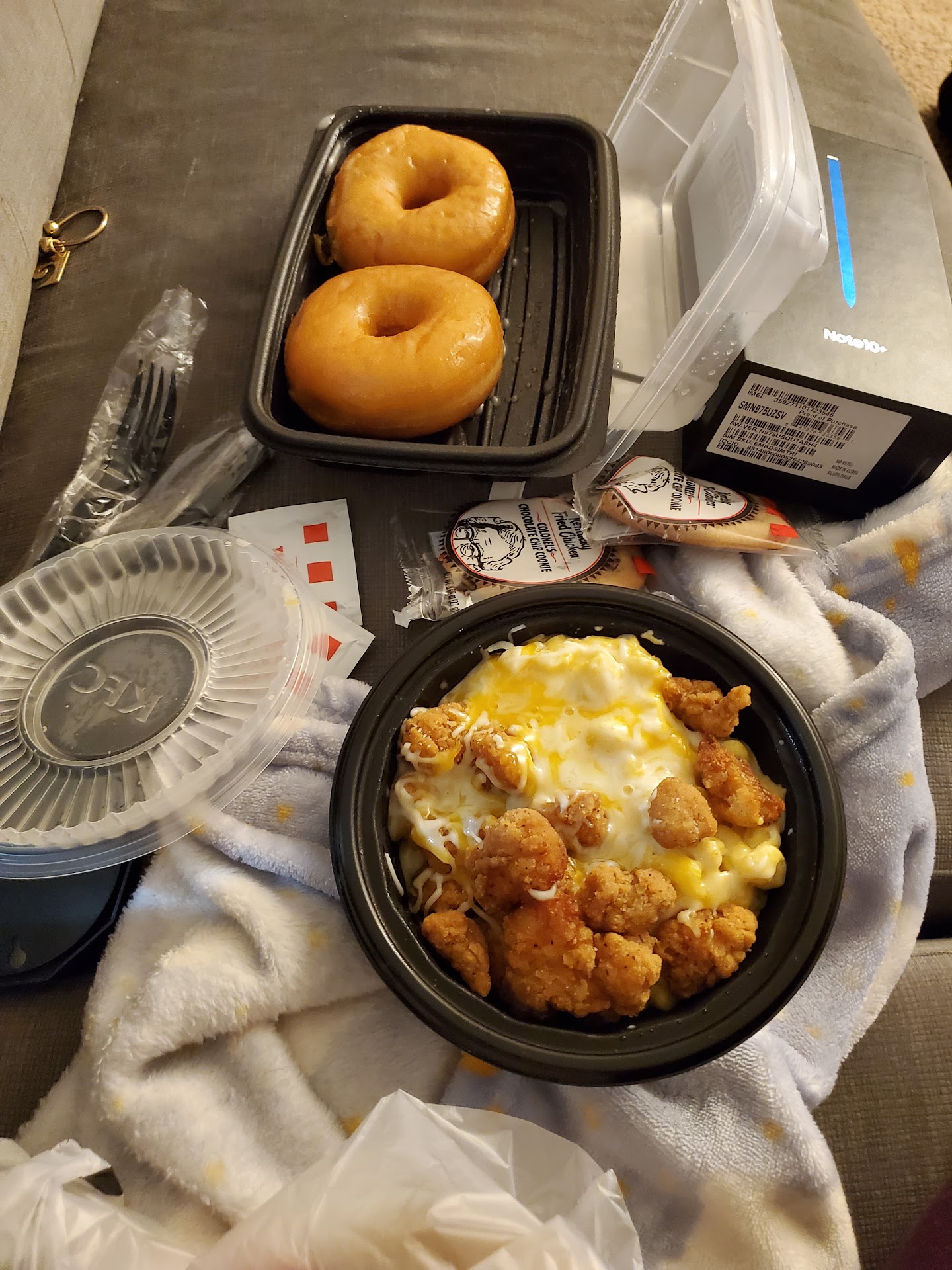The sides are tiny individual sizes, and I got no cole slaw, but 2 corn, a mashed potato, and the mac. Canned corn tastes better than theirs! Had I been able to choose, we would have gotten double potatoes and double slaw, which is what I was really craving! They gave us no thighs, and 2 wings, 3 drumsticks, and a breast 5 of the 6 pieces were the smallest ones they make! It also seemed like they just feied the original recipe since it didnt have the extra crunchy coating that we were used to.