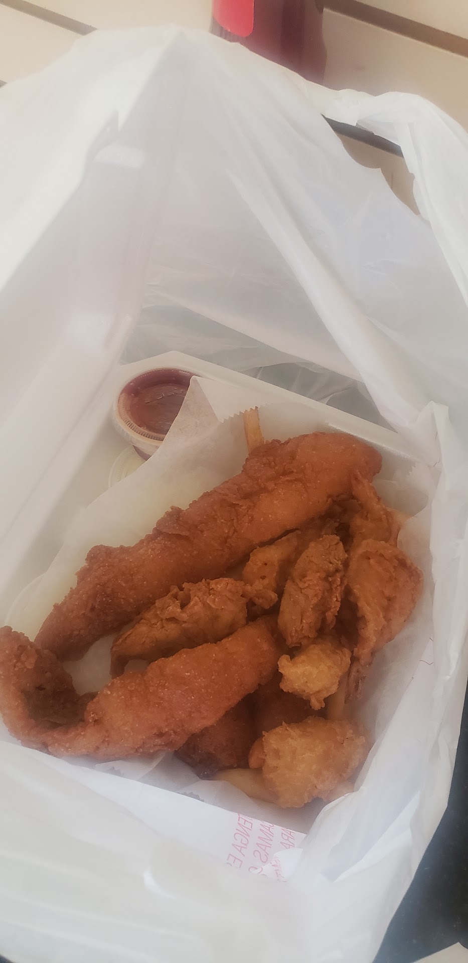 Read moreChecked out this place on Friday for lunch. Little spot right off little creek. Clean doesn't smell like seafood which is good. I got tilapia, and shrimp.. I saw that they sold fried crab so I got a pair to try..the tilapia was good nice and big good breading. Didn't care for the shrimp to much that batter was not good more batter than shrimp. Now to the fried crab I was really excited they look good nice and big, but the batter had zero flavor shame that batter has to have a good flavor. The restuarant also does provide the hot sauce vinger mix SMH. Other that the place wasn't bad I can see myself back just not for the...