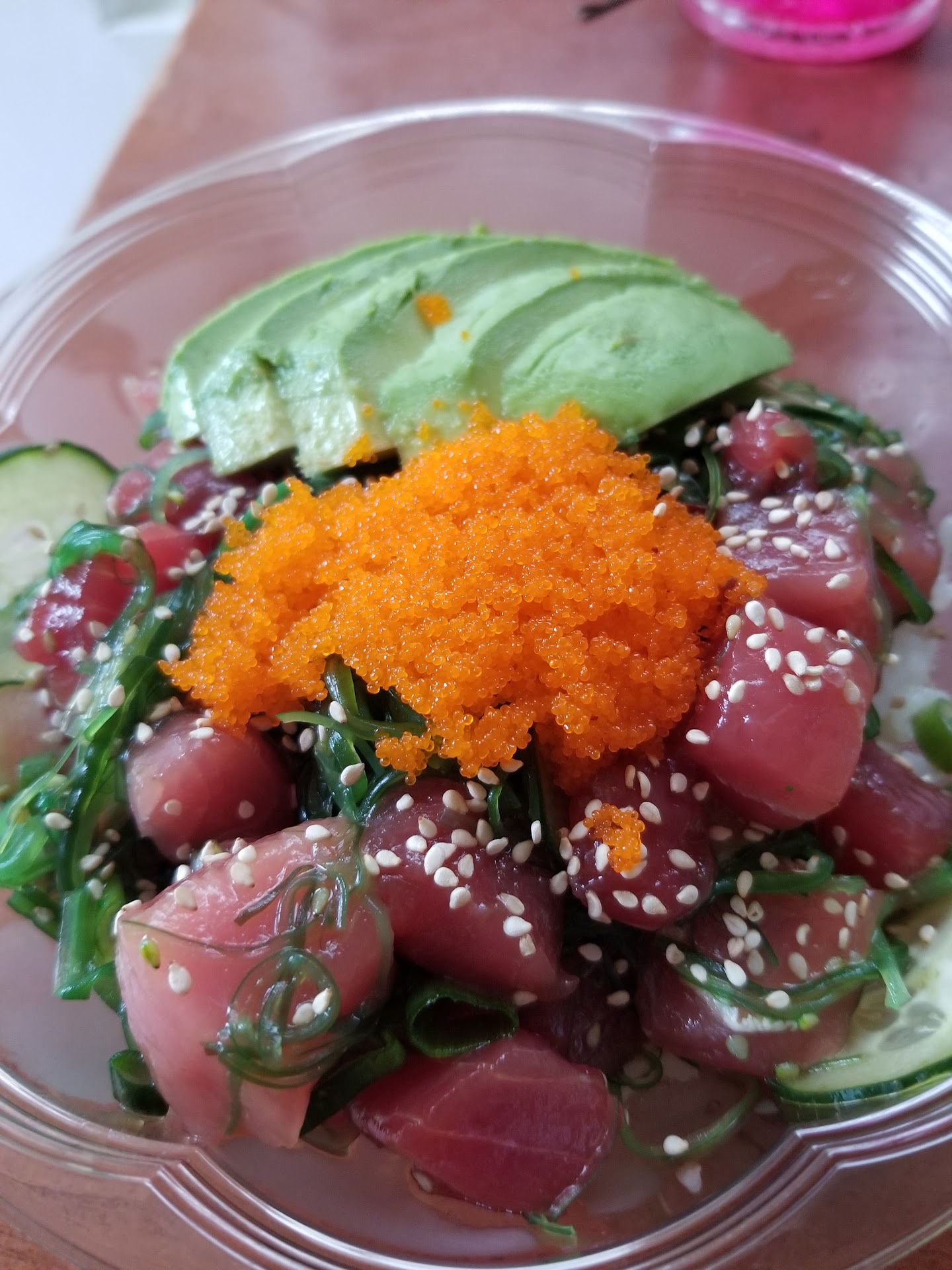 I ordered a poke bowl that was nothing short of epic: double salmon, carrots, spring mix, rice, avocado, green onions, fried onions, seaweed salad, and imitation crab, all slathered in the perfect amount of sauce. Yes, it was as good as it sounds. Plus, I was suggested to I grabbed a plantain dessert—this thing was like a sweet, sugary hug for your taste buds, all wrapped up in a lumpia wrap.