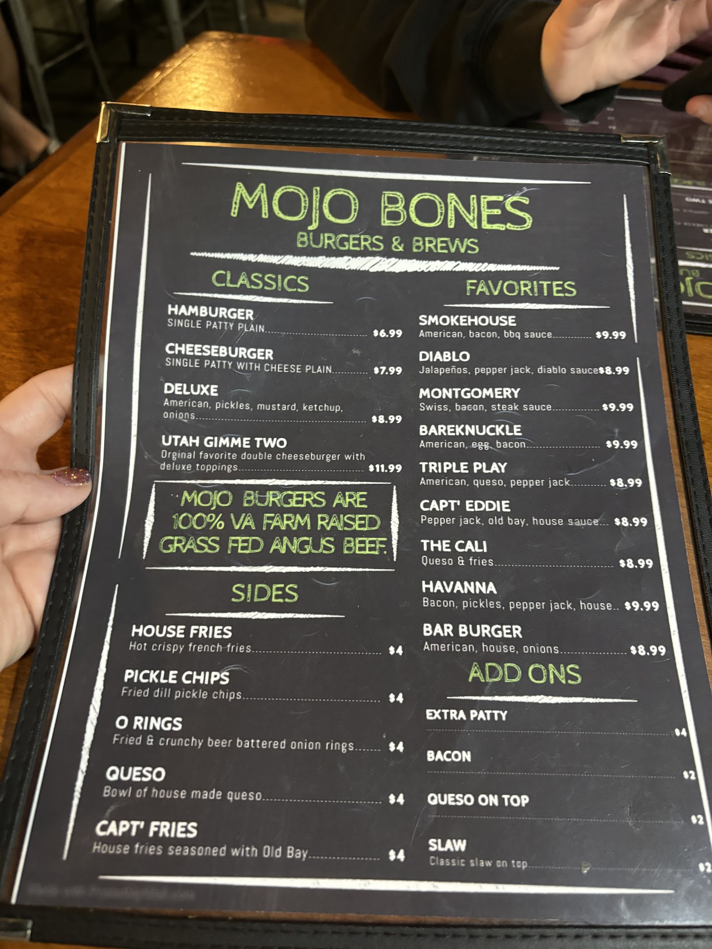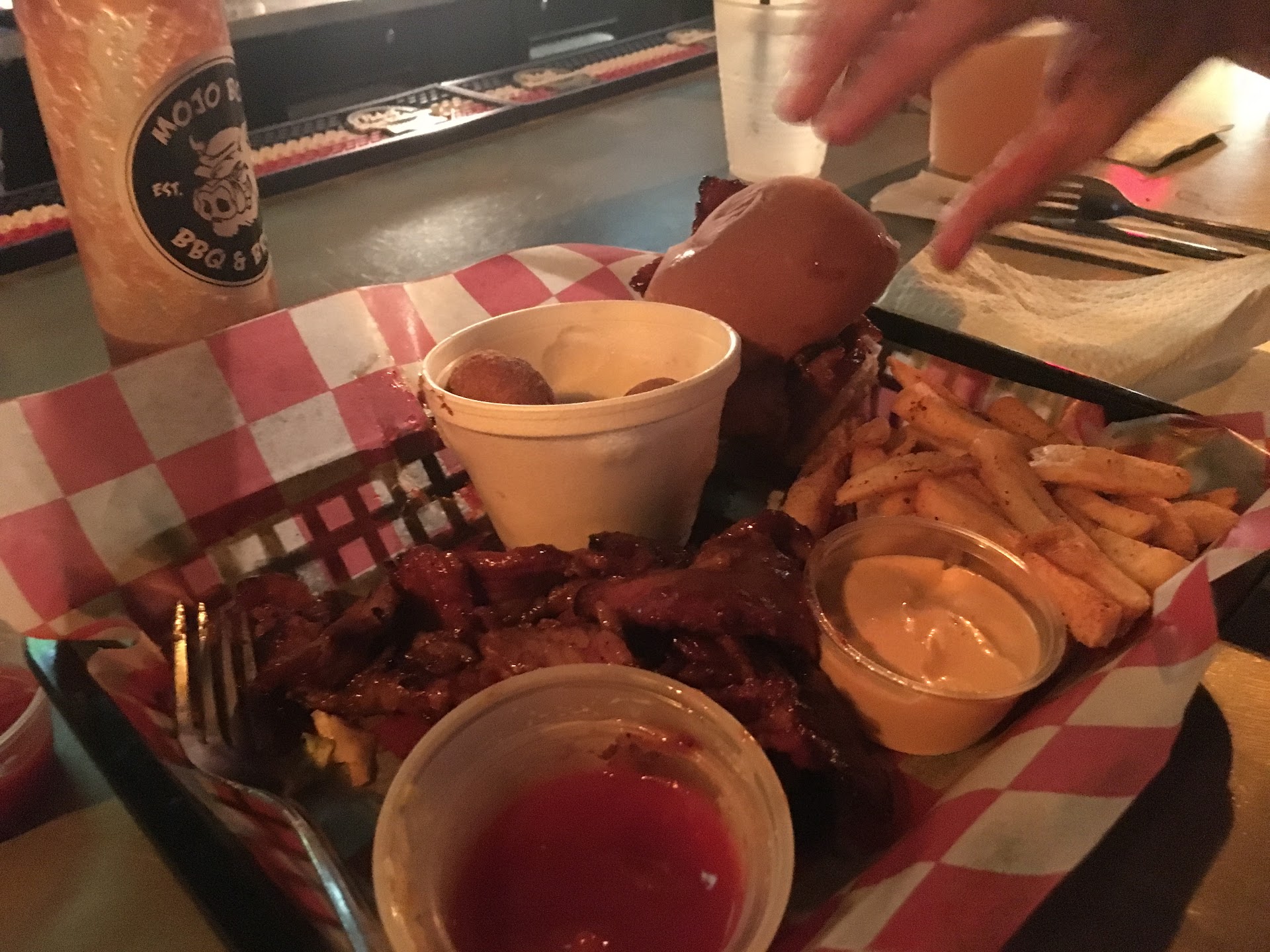 Read moreIf I could give zero stars I would, very disappointed. On November 1st, my boyfriend and I wanted to check out wing night and had planned on coming here all day. We checked out the wing flavors online and planned on getting Honey Hickory and Garlic Parmesan wings. We walked in and were immediately greeted by our waitress, who then informed us that both Honey Hickory and Garlic Parmesan wings were unavailable (leaving only 8 other flavors) which was fine for us but we needed more time to decide since our original choices weren't available. She came back 3 more times within the next 2 minutes to ask if we were ready and we were clearly not because we were still nose-deep in the menu discussing what to get instead. After a few minutes we decided what we would get, put our menu on the end of the table, and waited for her to come back. There were only three other people in the restaurant and they were drinking at the bar. Our table was right next to the bar, and where our waitress was leaning, I could've taken four steps to reach her. After about 7 or 8 minutes of watching her sit on her phone, texting, and talking to the bartender we decided to walk out. We left just after she proceeded to casually make a phone call on her cell phone. We had been waiting almost 10 minutes for her to come back (which would've only taken four steps). We have never left a restaurant like that. We stood up at the table for almost a minute to give her a chance to come over to us but she just watched us. We took our business to another wing night and will never come back to Mojo Bones. Absolutely disappointing service they...