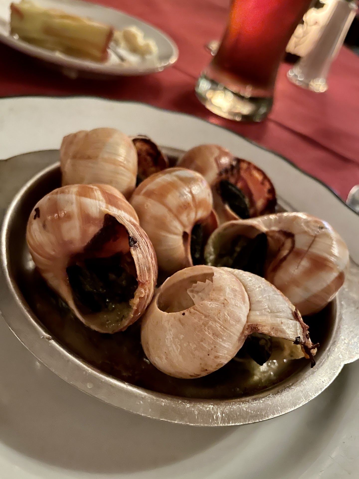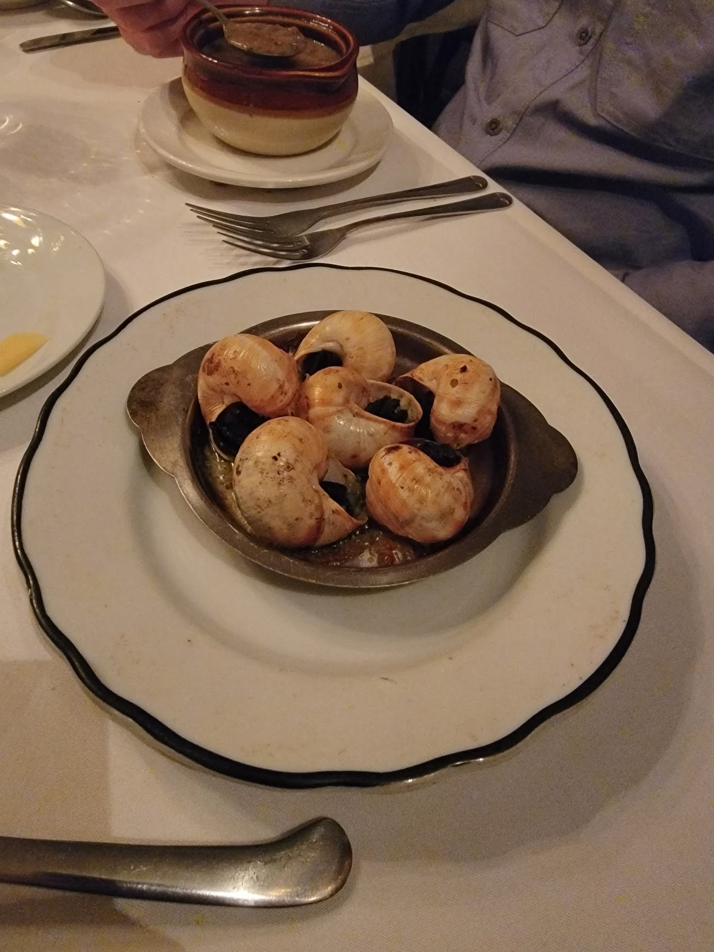 Things were busy tonight, but the excellent wait staff stayed on top of everything, everything was snapped to the table out of the oven--and cleared almost before you could snatch the last bite. But the food is so good you don't mind fighting to keep it while you scrape the plate. We came early so there was no danger of Monastery's kitchen running out of anything, but we did regret that the Chefs had elected not to serve the Crepes Suzettes among the desserts this evening: an excellent engineering decision on a busy night, but--we will certainly...