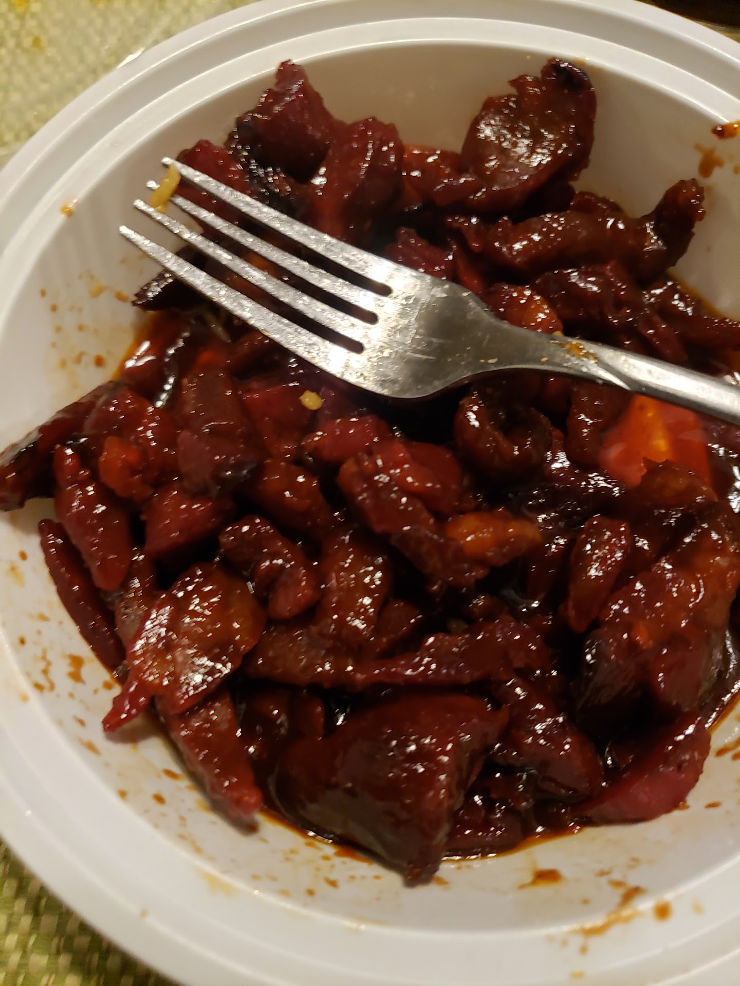 The chicken friend rice may have been mixed with old rice because when I opened the box the top of the rice was soft. It wasn’t unit I started forking through that I found hard clumps of rice. It only had 5-7 thin strips of chicken in it. I tasted it just to confirm that the rice was hard and it was lol. So I didn’t eat the rice, just picked at the chicken.